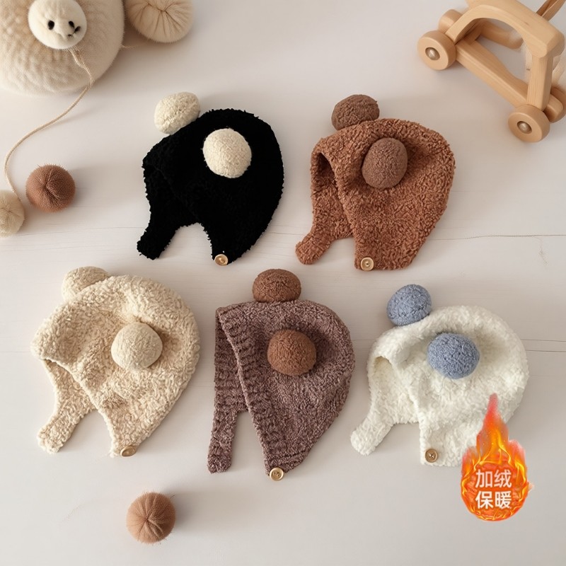 尼多熊婴儿帽子秋围脖一体宝宝毛绒帽防风护耳帽冬季保暖婴幼儿帽