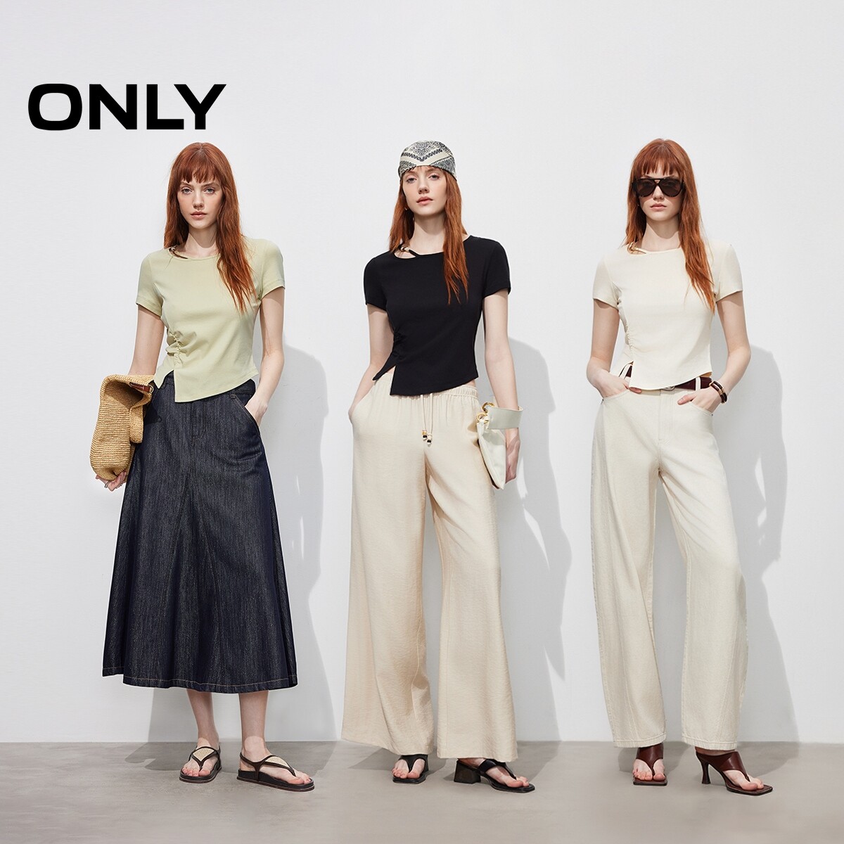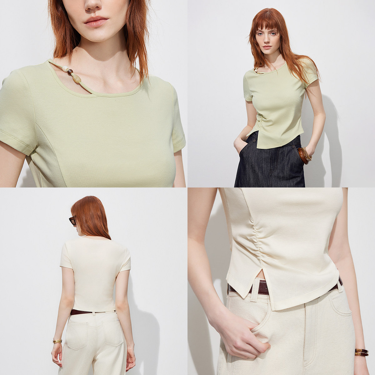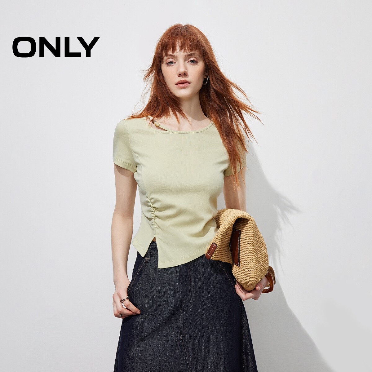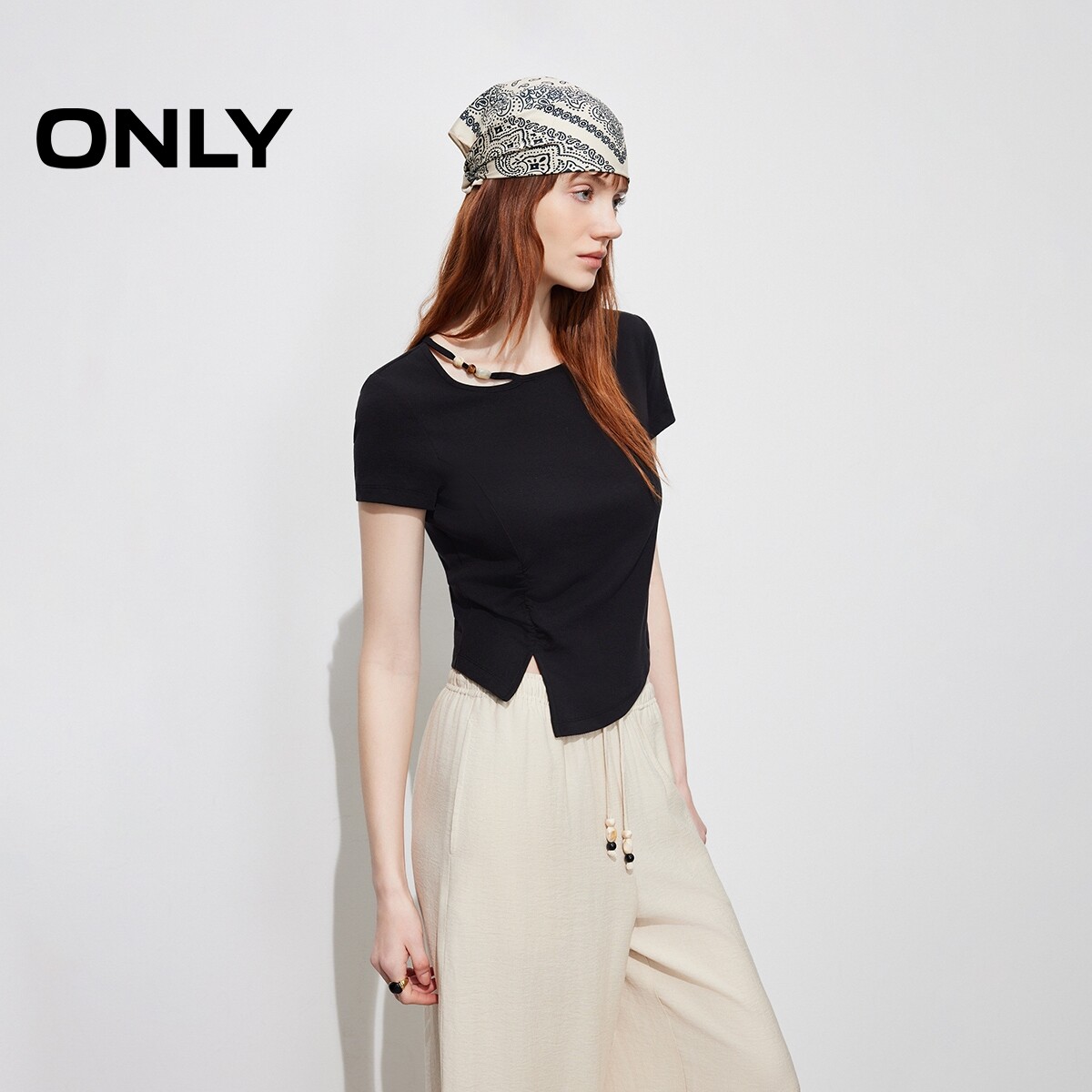 ONLY2026春季新款透气含莱赛尔镂空串珠收腰开叉短袖上衣T恤女