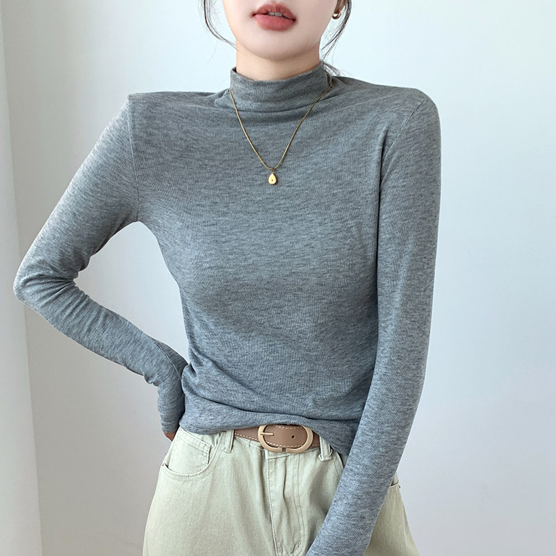 widelia十三行老板娘冬正肩小立领半高领打底衫弹力长袖T恤女9585