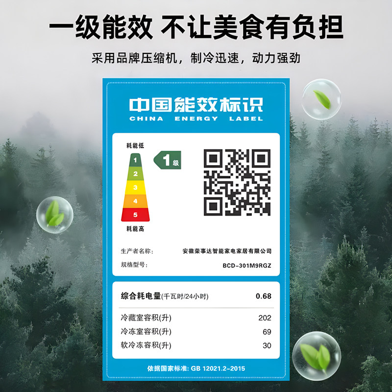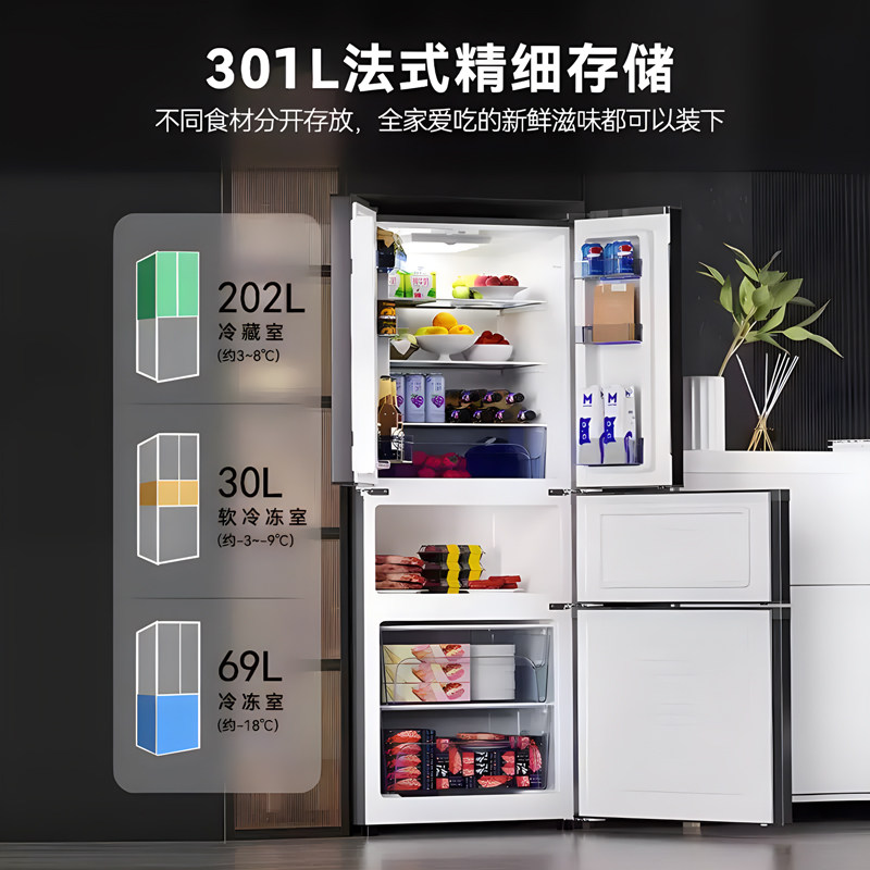 荣事达301L法式冰箱家用一级能效超薄嵌入式小户型多门节能电冰箱