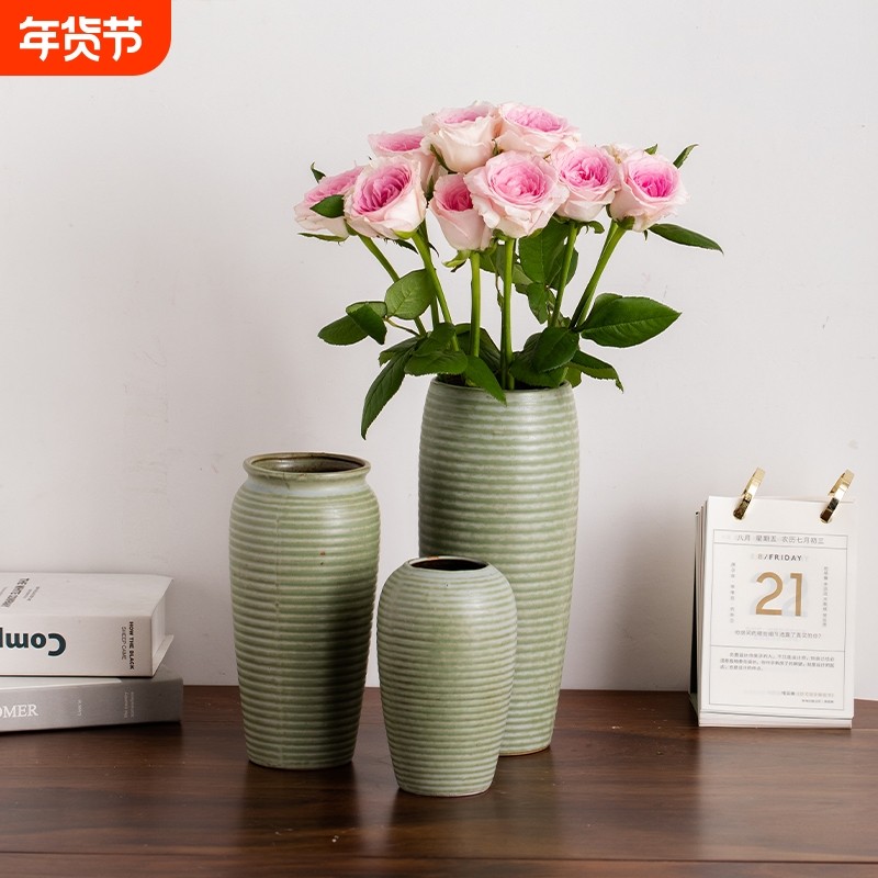 新中式复古陶瓷花瓶干花鲜花陶罐客厅插花摆件轻奢高级感绿色花器