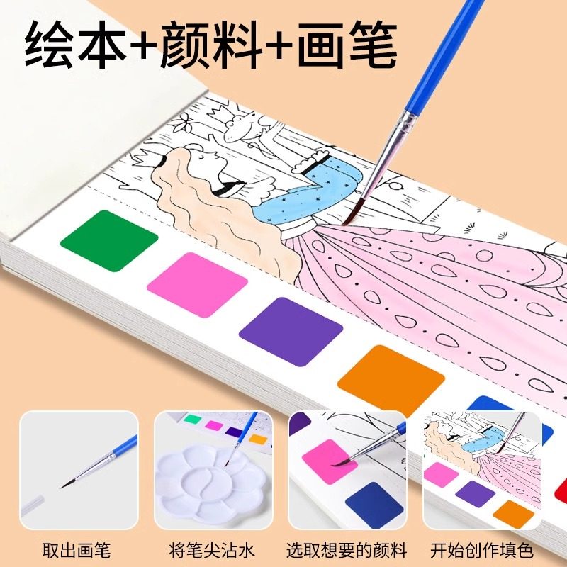 儿童水彩涂色本便签涂鸦画画填色书幼儿园自带颜料水粉便携绘画本