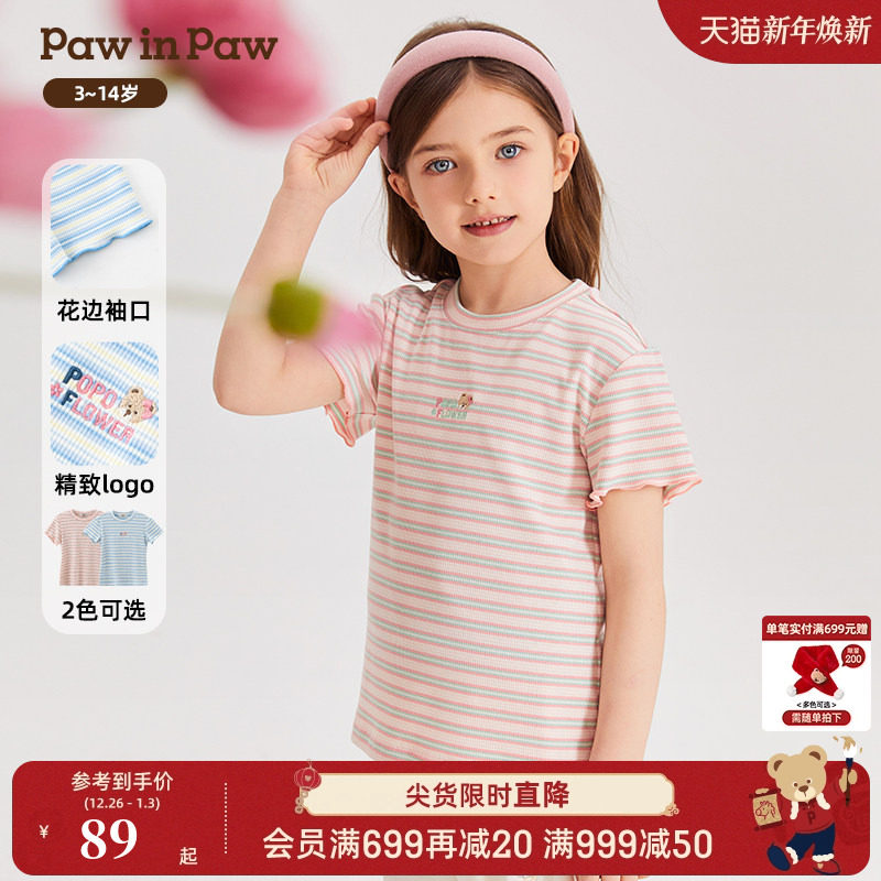 PawinPaw卡通小熊童装夏季女童条纹印花短袖针织儿童T恤
