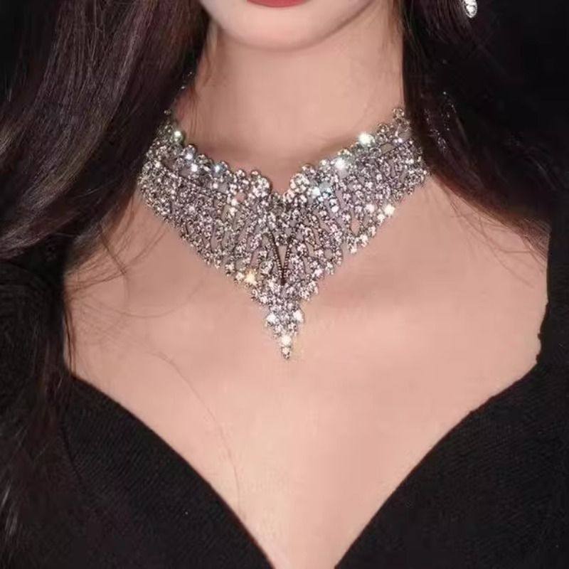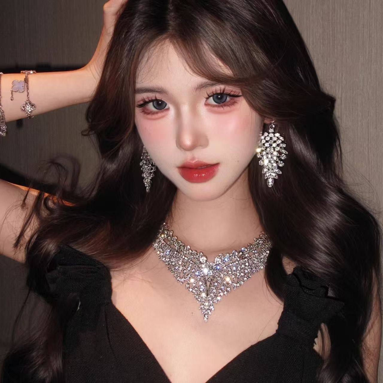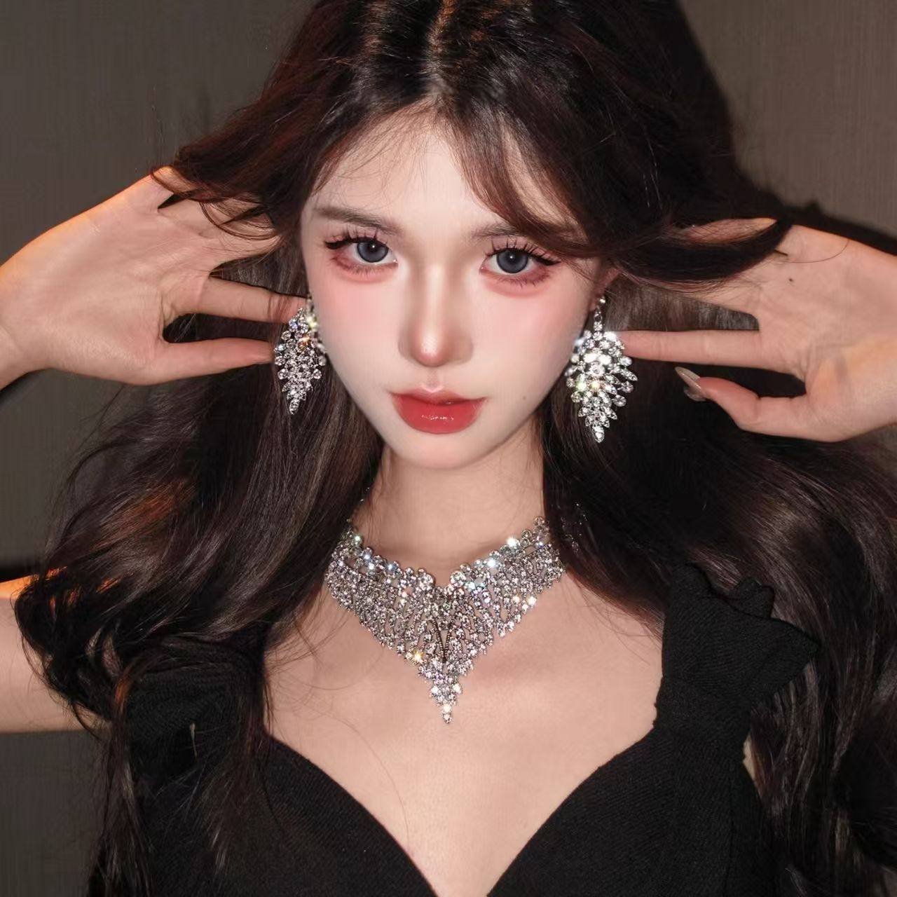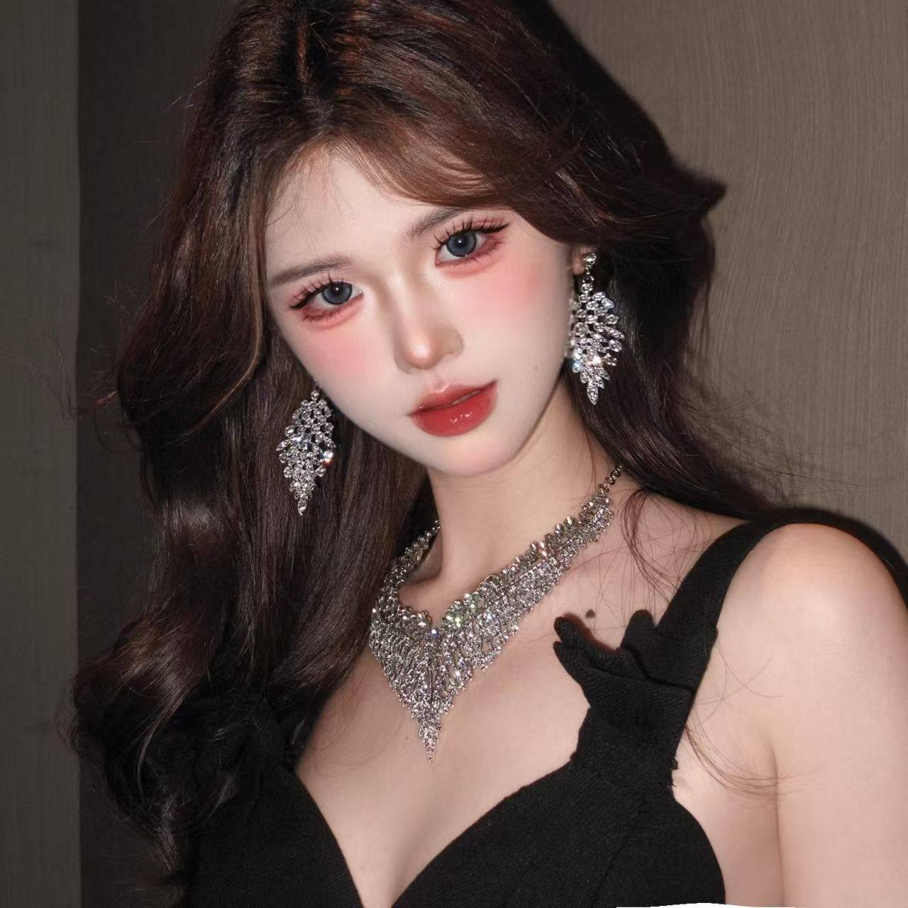 高级感超闪气质满钻流苏项链耳环轻奢晚宴礼服夸张锁骨链颈链耳环