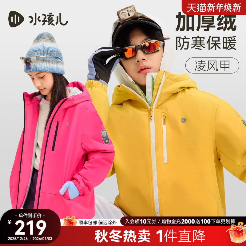 水孩儿童装外套加绒2025秋冬装新品男女大童厚风衣三防红色上衣