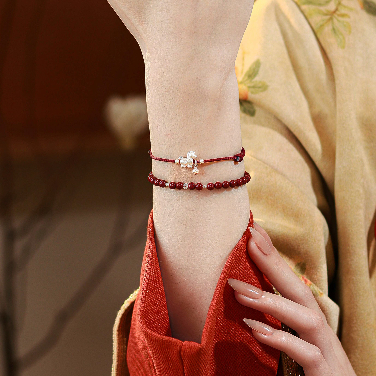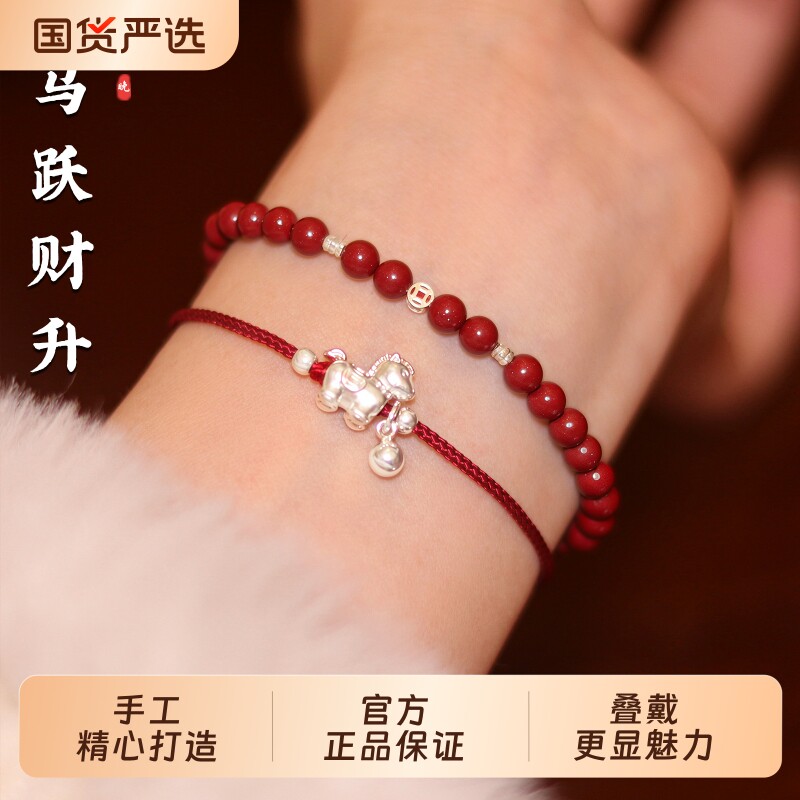 马跃财升天然朱砂手串正品女款足银999马本命年红手绳手链叠戴