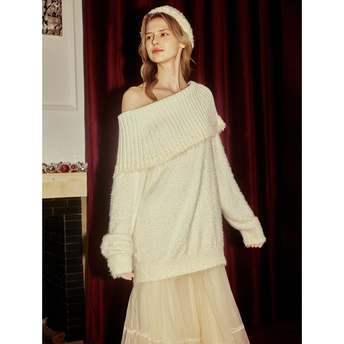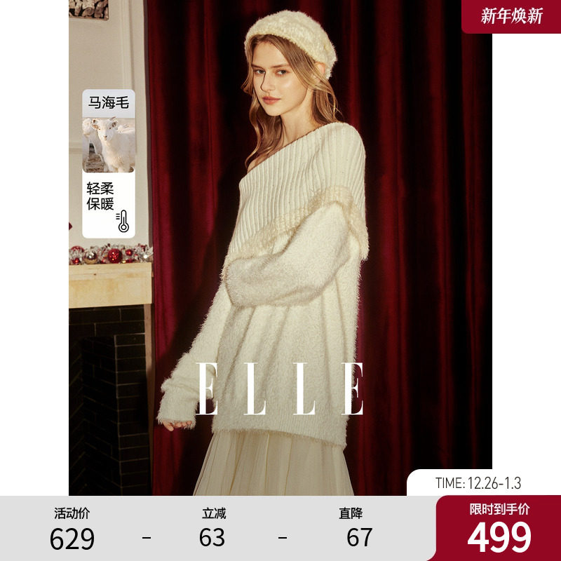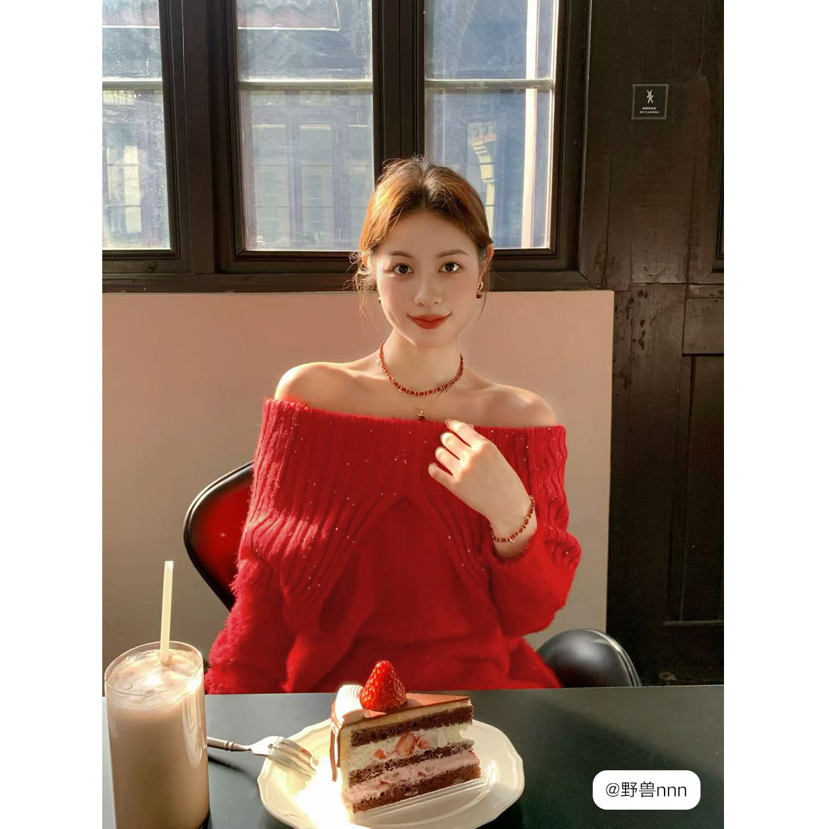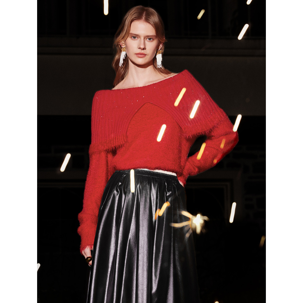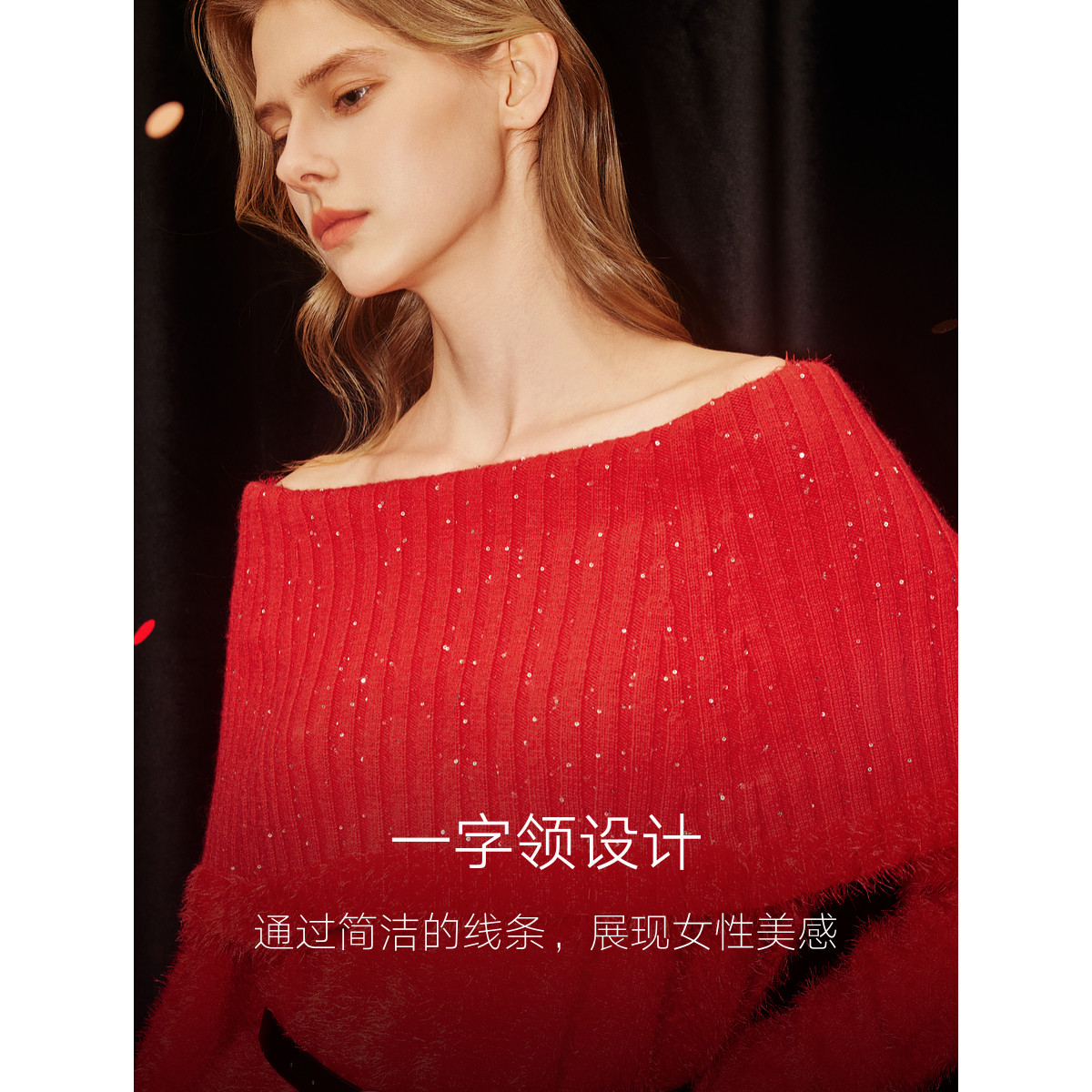 【XUZHI】ELLE马海毛红色一字肩针织衫女2025秋新款高级气质毛衣