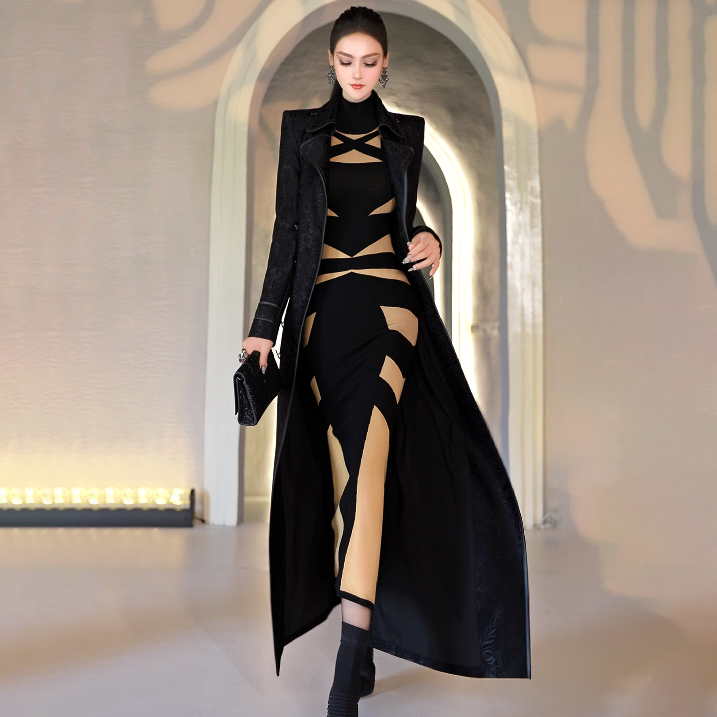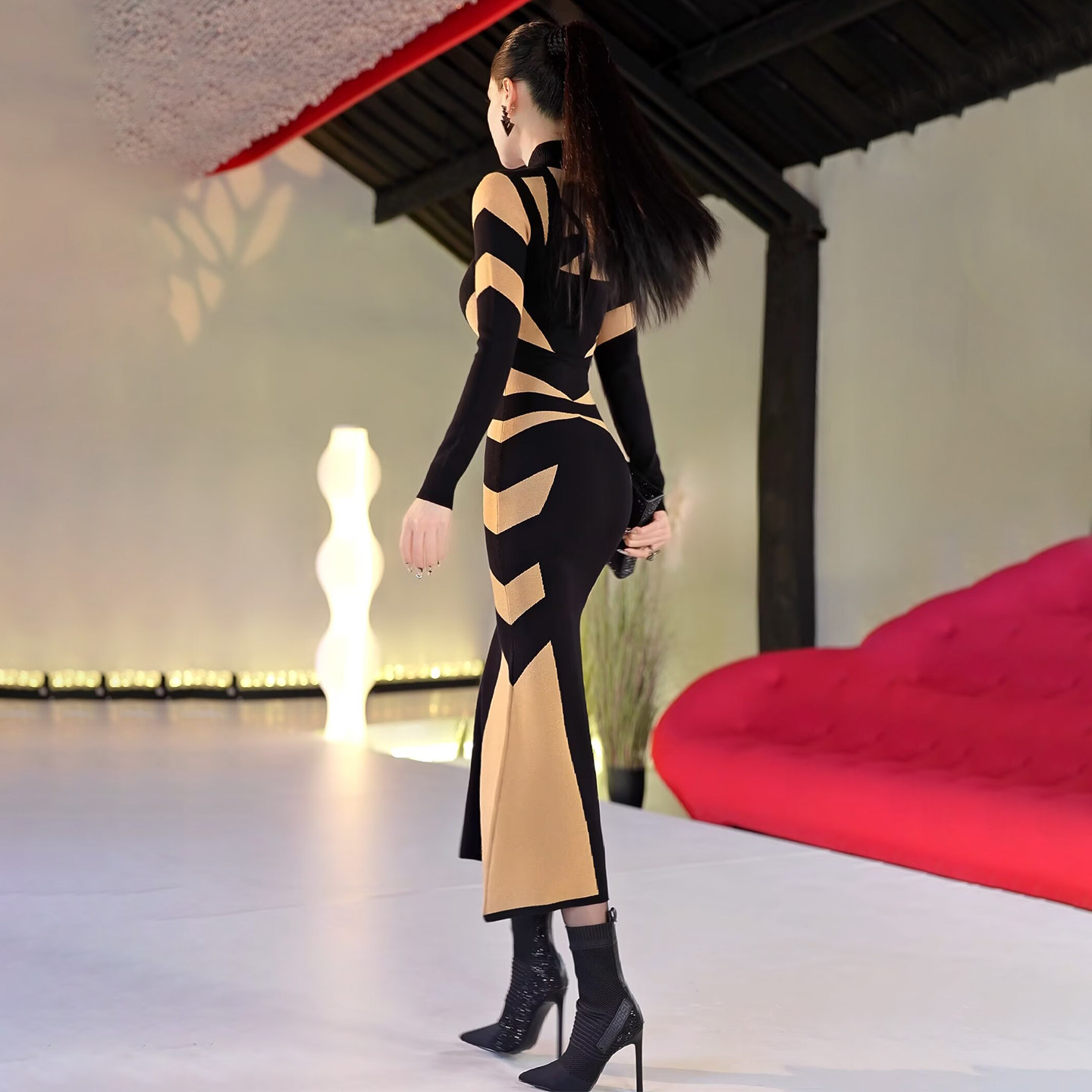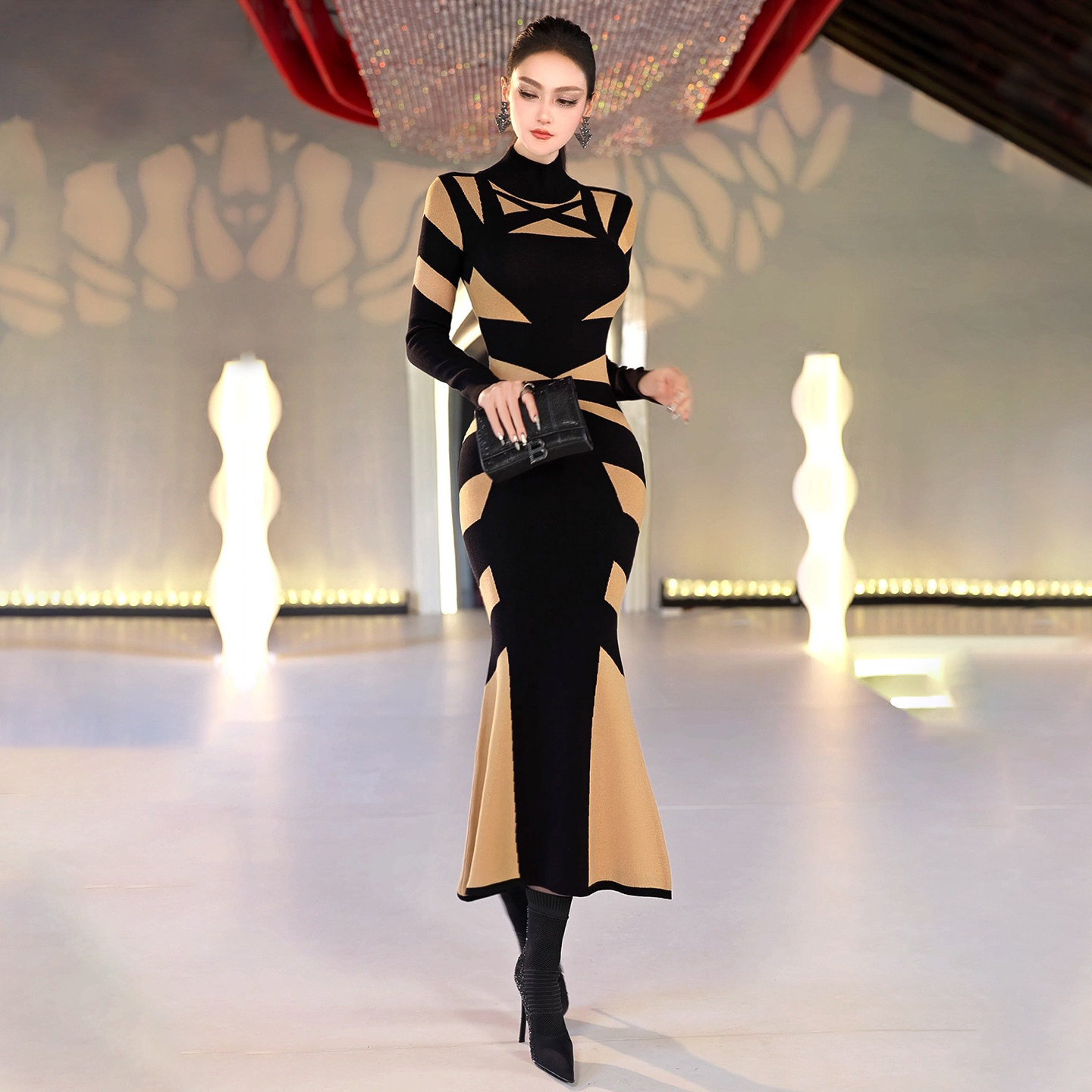 秋冬欧美几何拼色高领毛衣针织连衣裙2025新款时尚中长款鱼尾裙