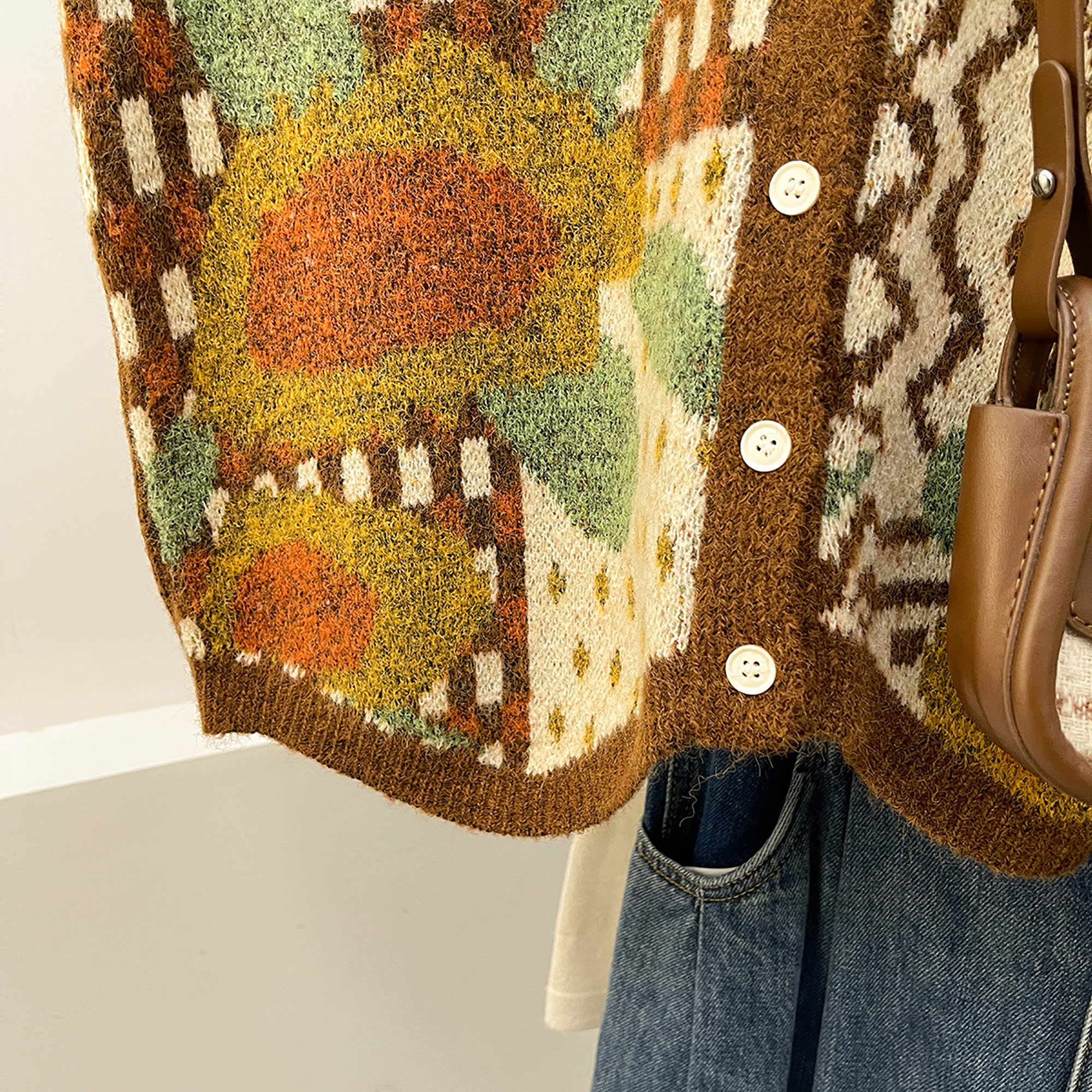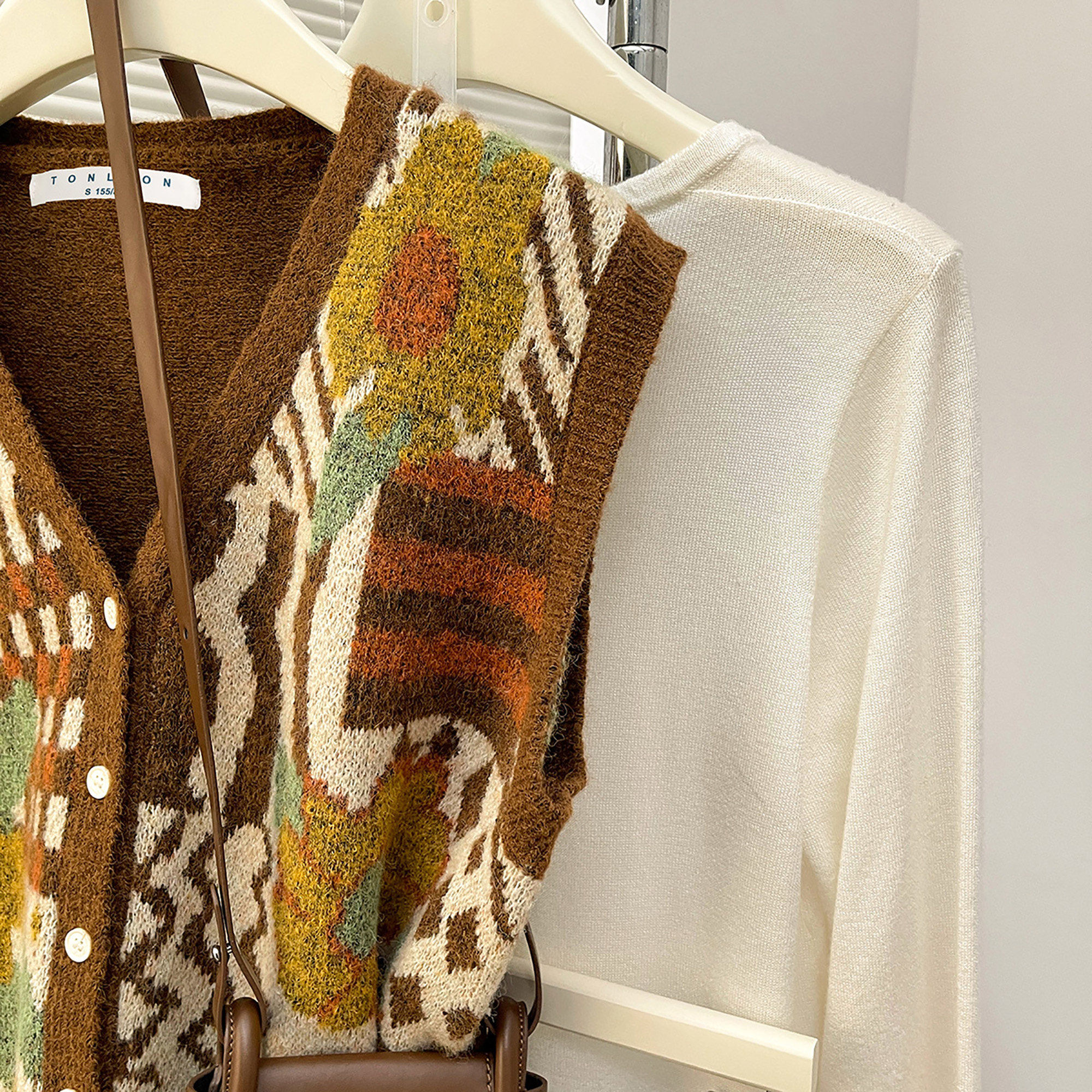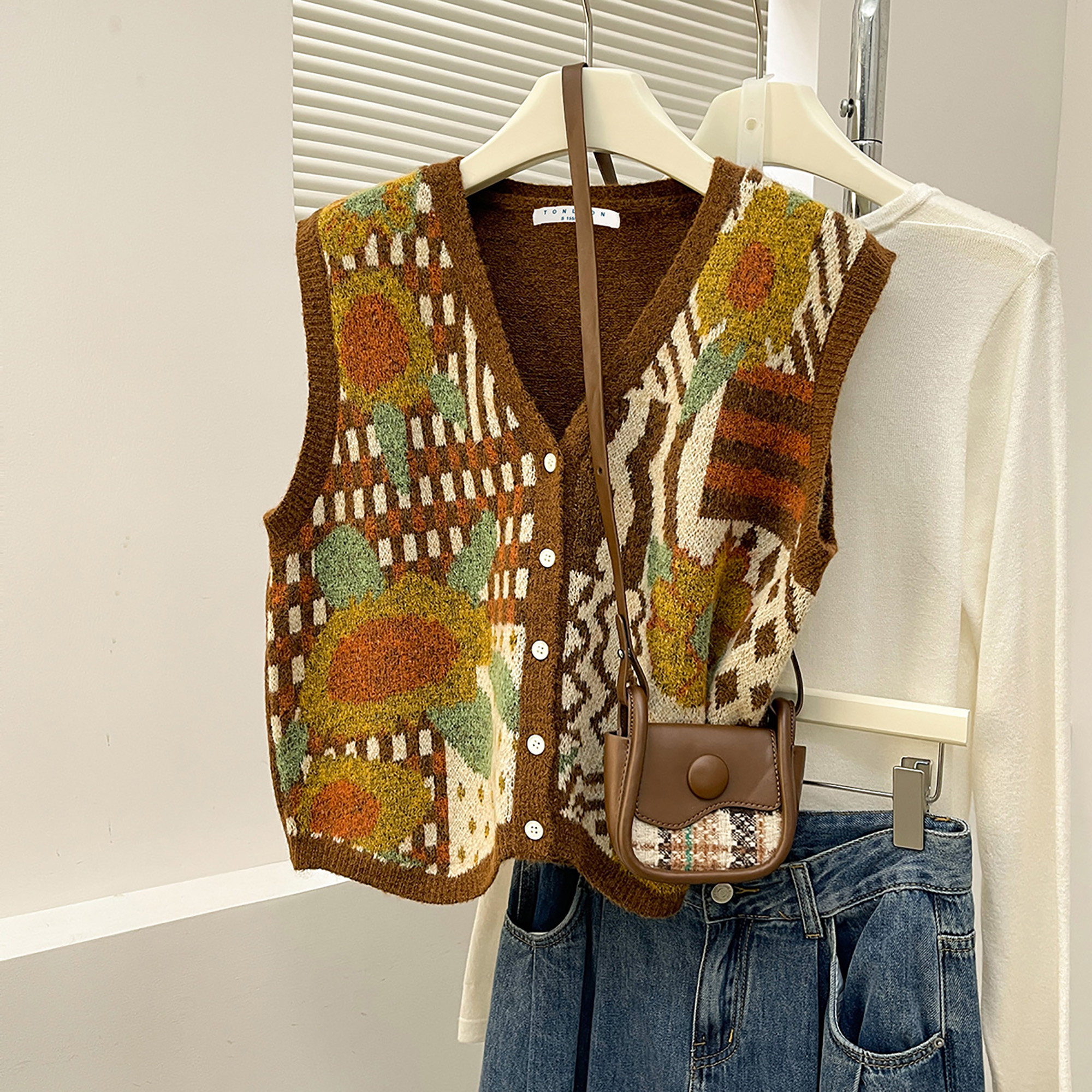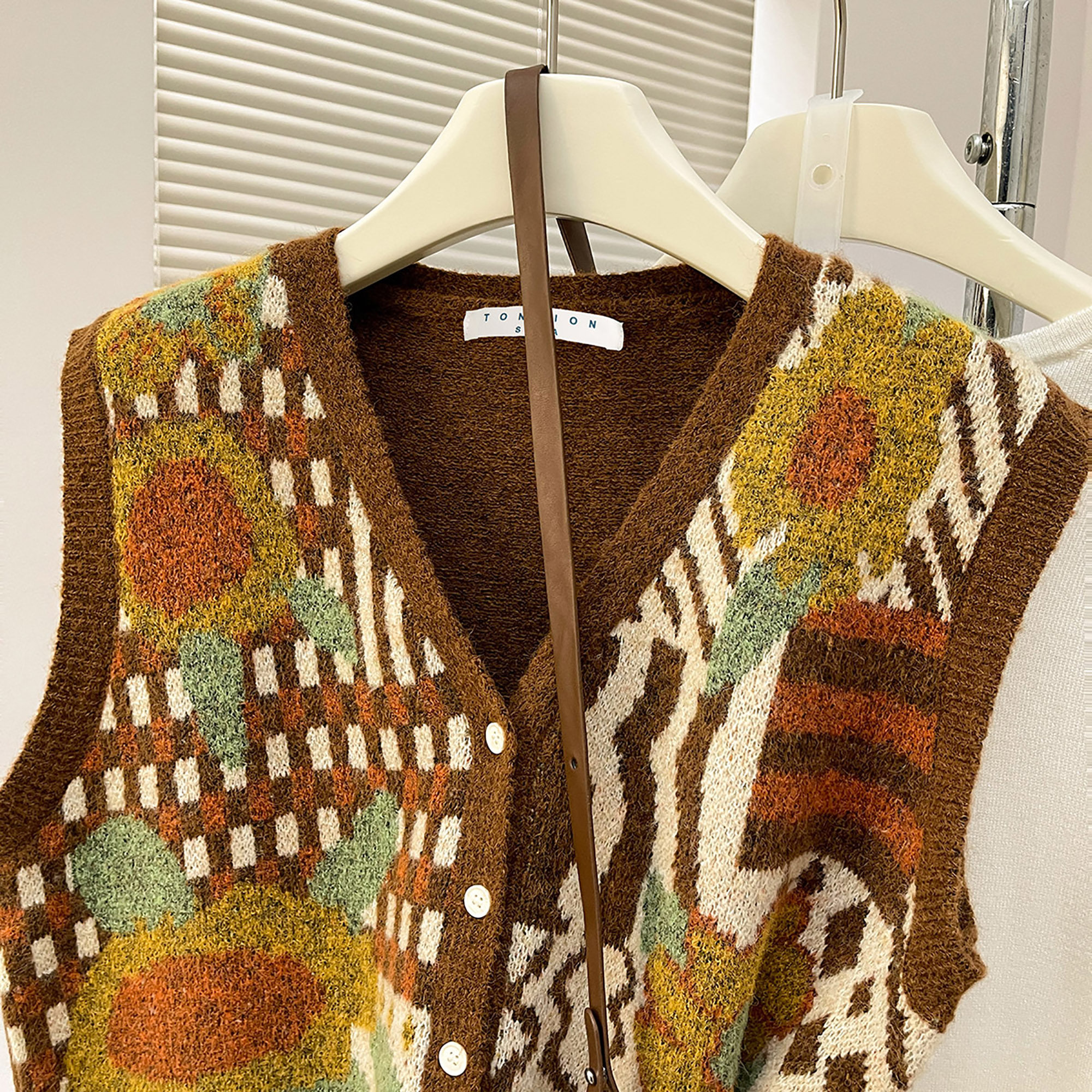 唐狮秋冬季女毛衣复古图案V领开衫马甲背心设计感美拉德毛线衫tu