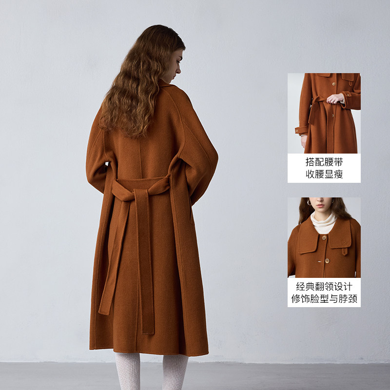 水沐飞高级感酒红色双面羊绒大翻领毛呢大衣女秋冬中长款羊毛外套