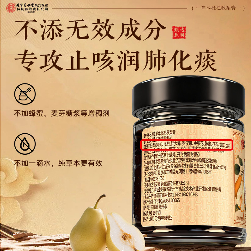 北京同仁堂枇杷秋梨膏润肺止咳官方旗舰店正品雪梨婴幼儿童无添加