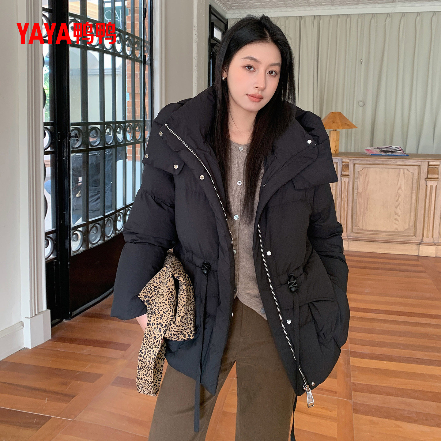 鸭鸭羽绒服女2025年秋冬季新款中长款连帽时尚保暖休闲鸭绒外套F