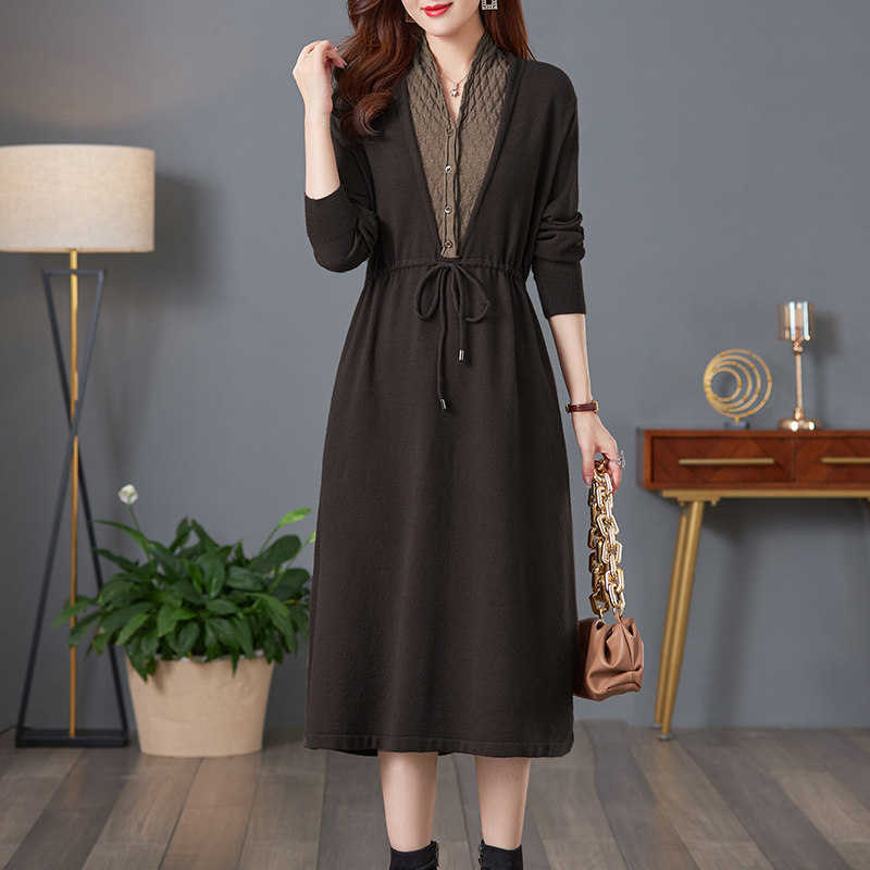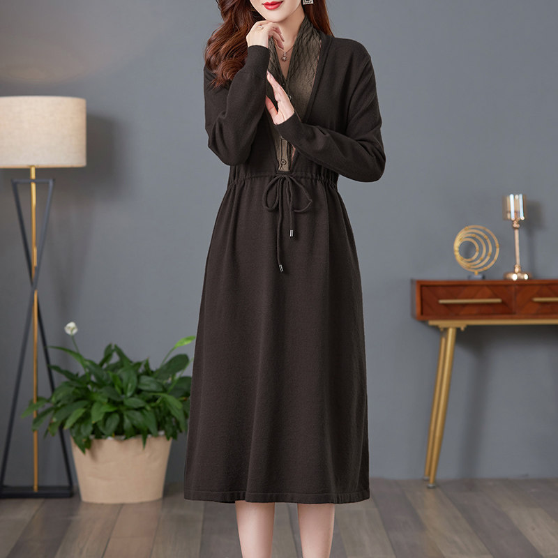 恒源祥2025年春秋连衣裙新款收腰蛋糕裙女装品牌圆领毛衣裙中长款