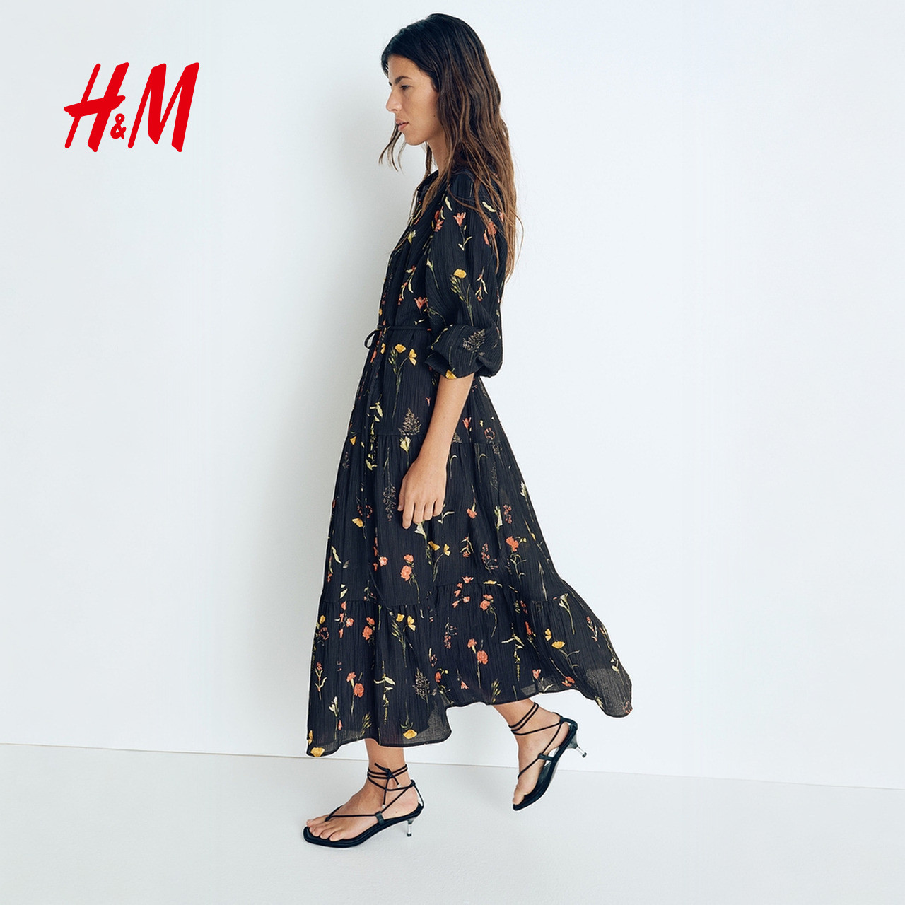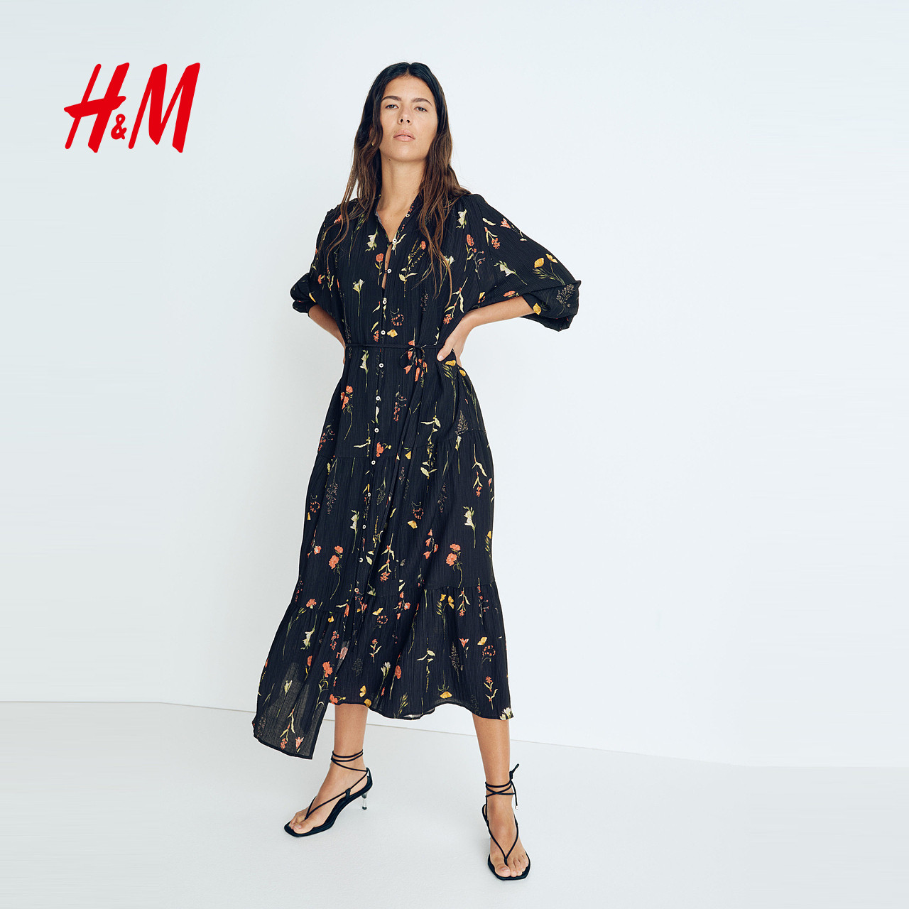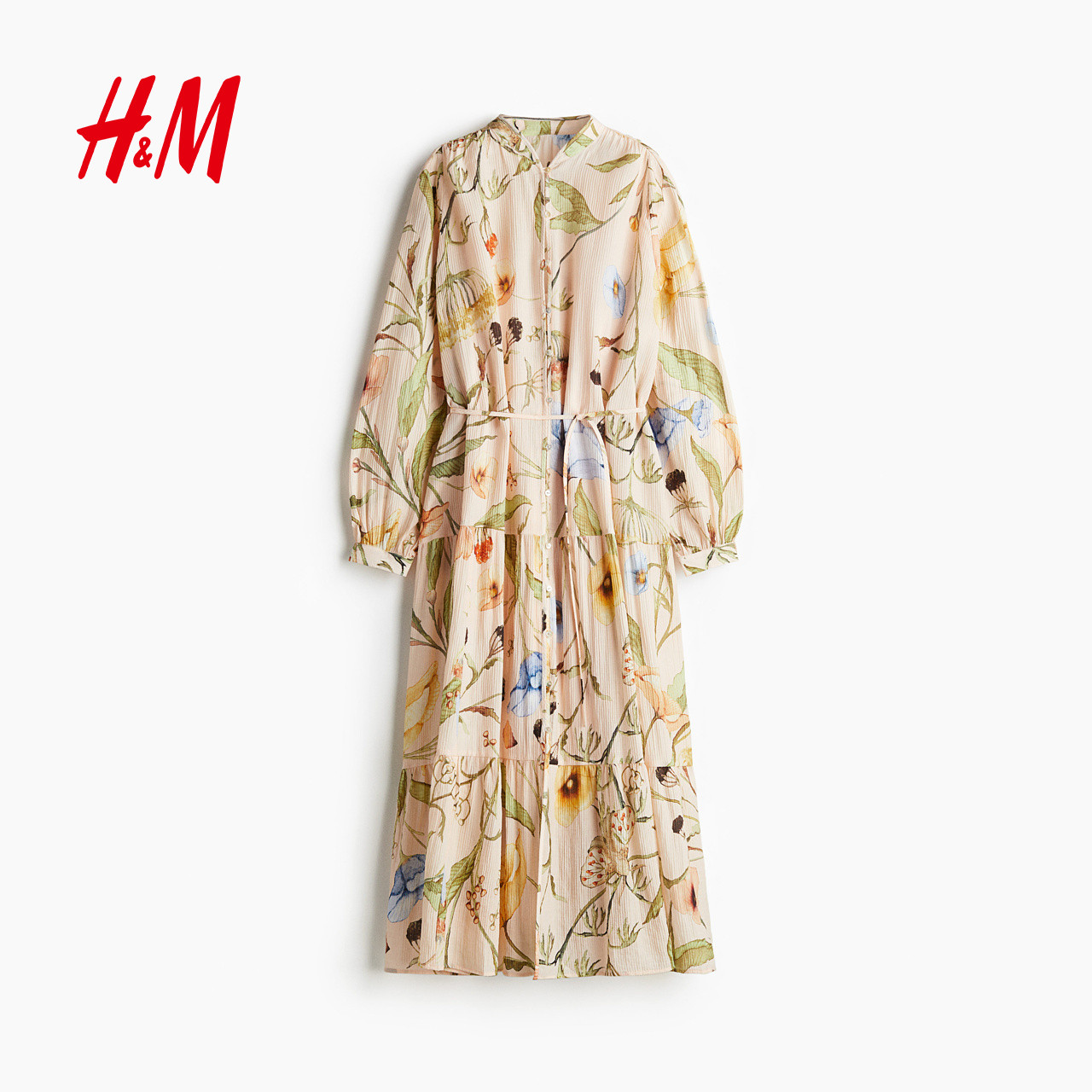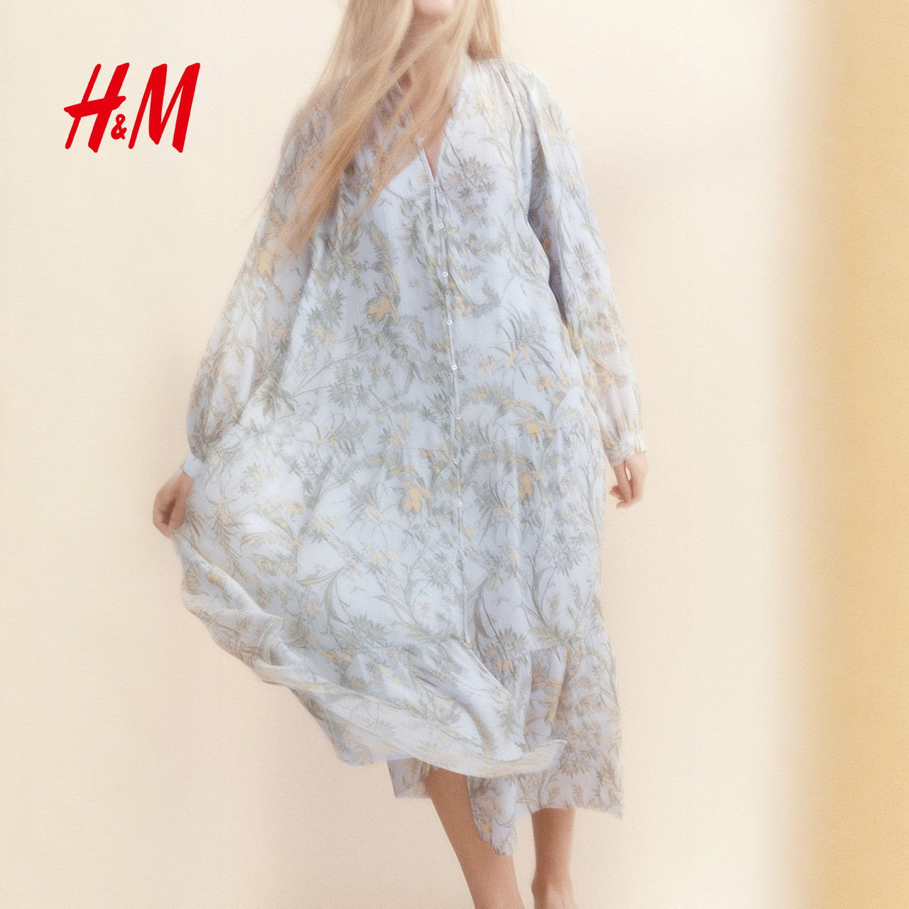 HM女装连衣裙夏季原野浪漫风花朵系带灯笼袖植物印花长裙1219083