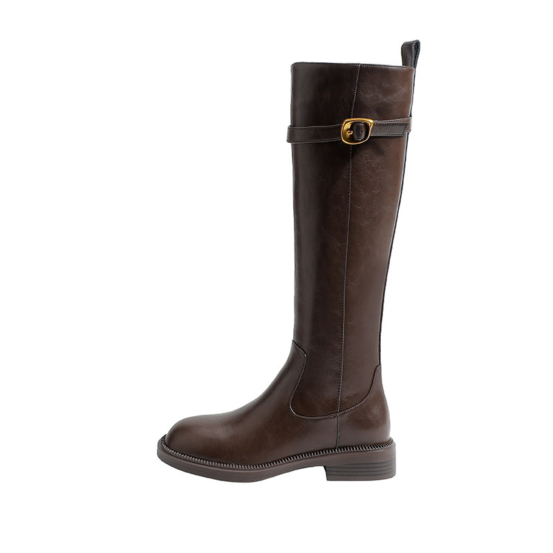 真皮~骄屿皮带扣骑士靴复古英伦风长筒靴棕色显瘦粗跟不过膝长靴