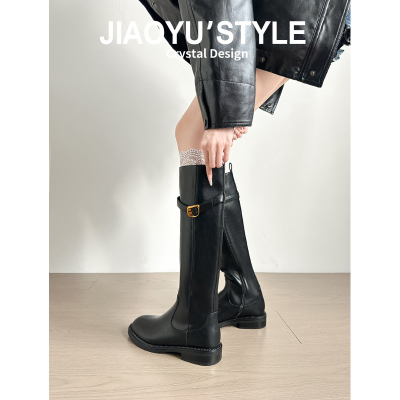 真皮~骄屿 内增高厚底长筒靴女2025新款圆头长靴平底骑士靴高筒靴