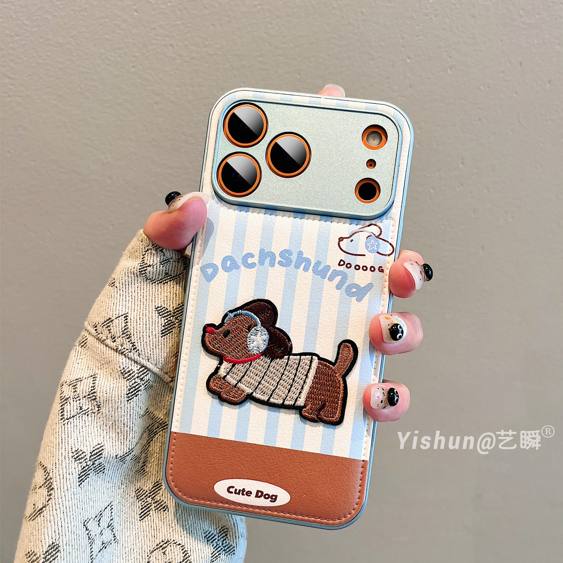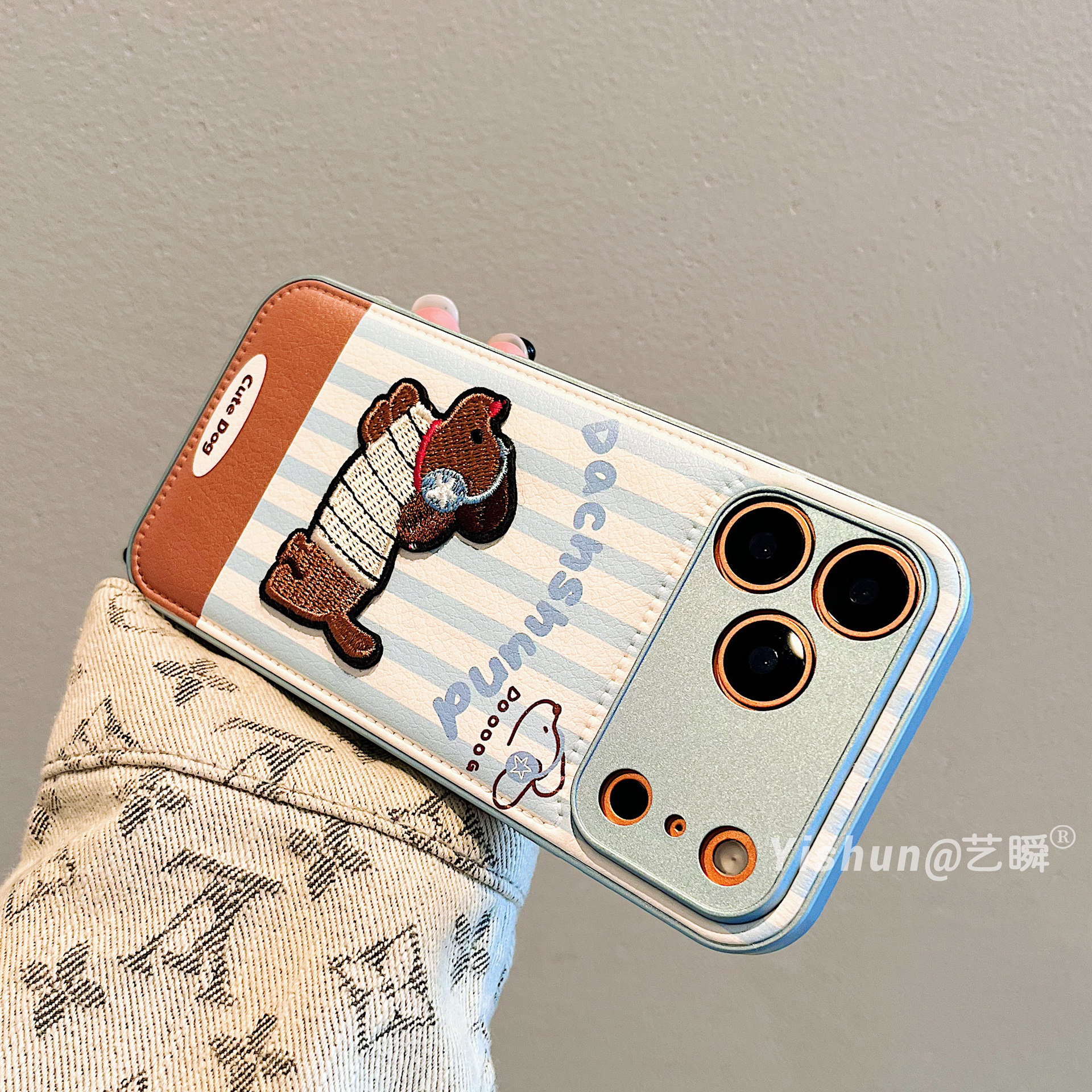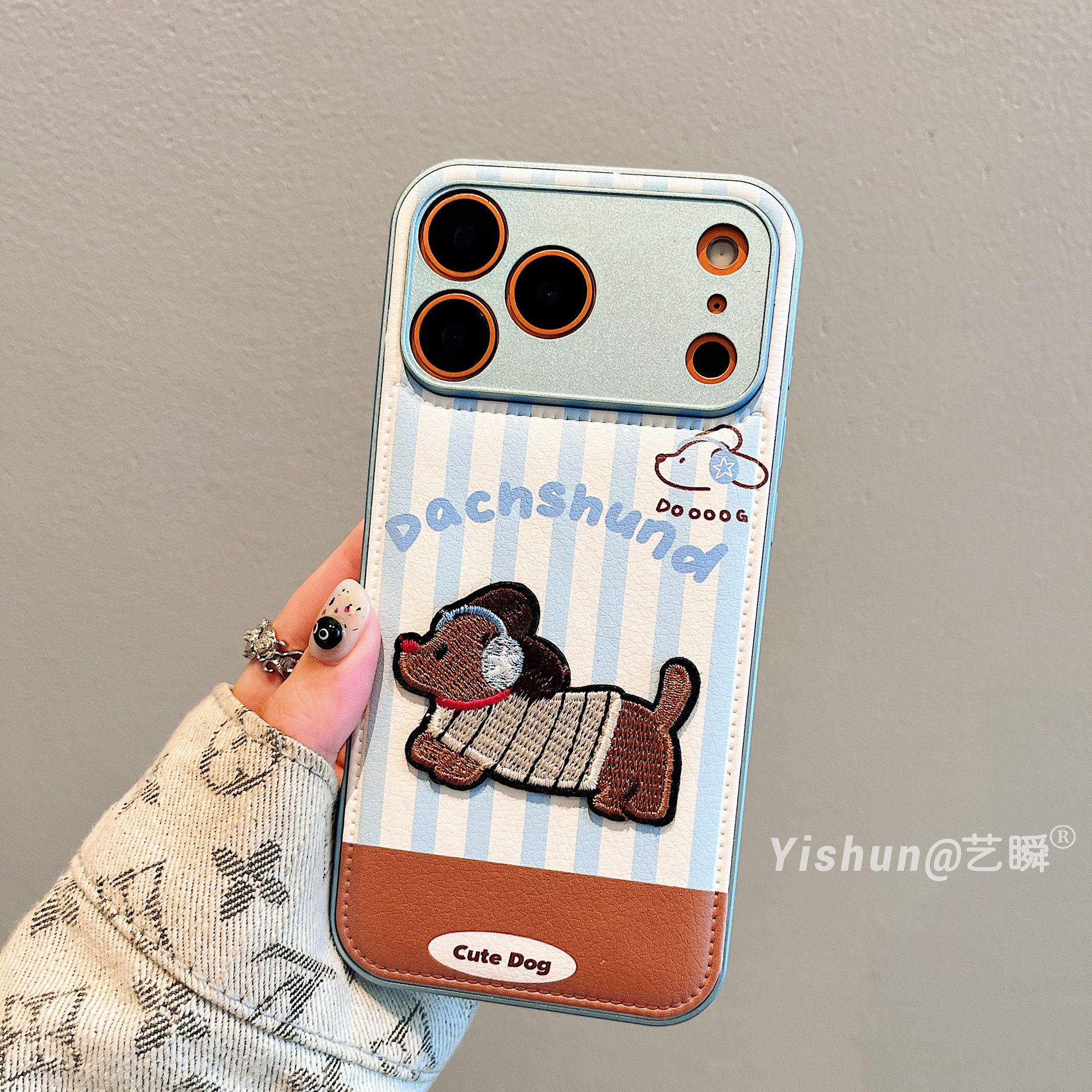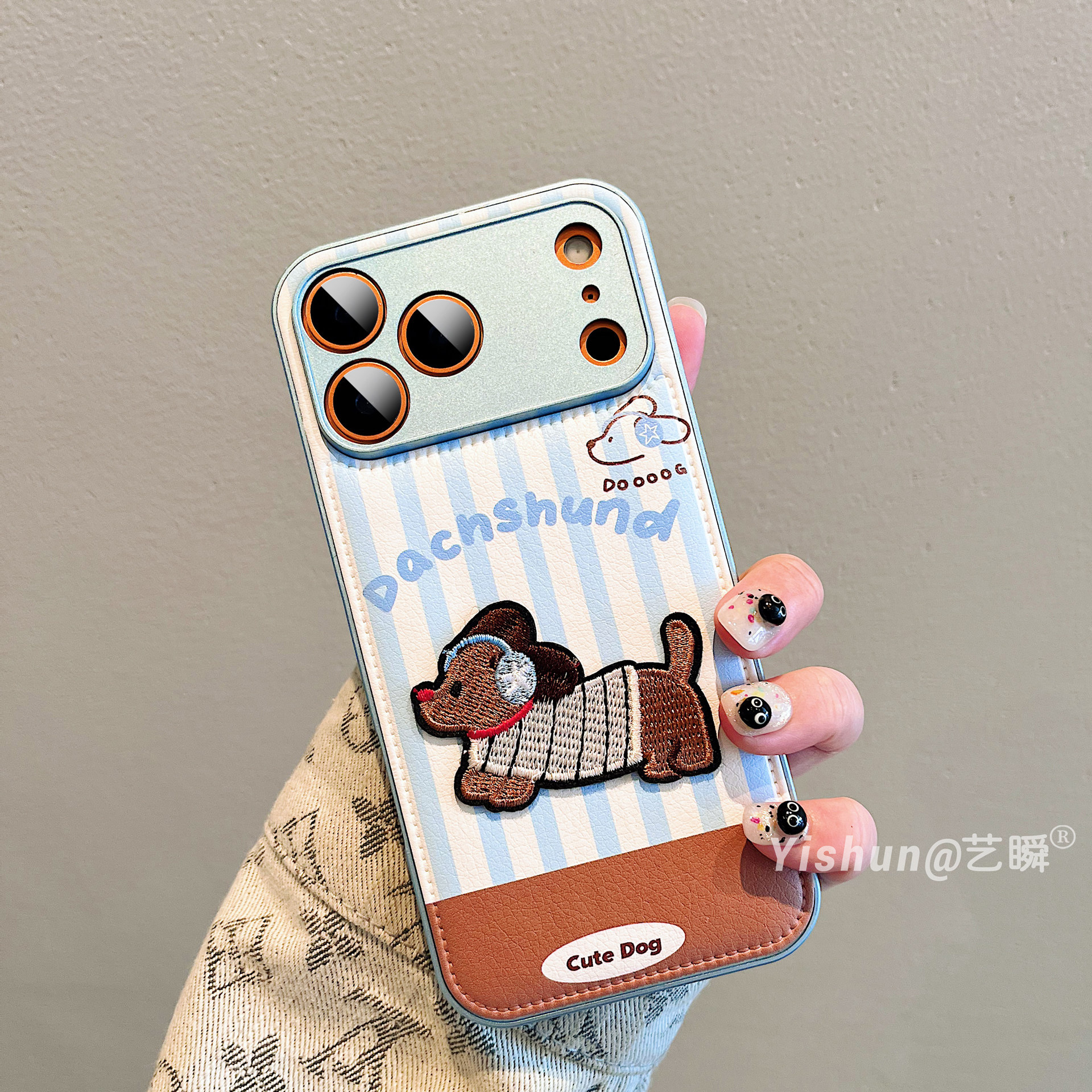 秋冬新款韩系高级条纹拼接刺绣腊肠狗适用iPhone17ProMax手机壳苹果16pro皮质鼓包13全包镜头15pro女14保护套