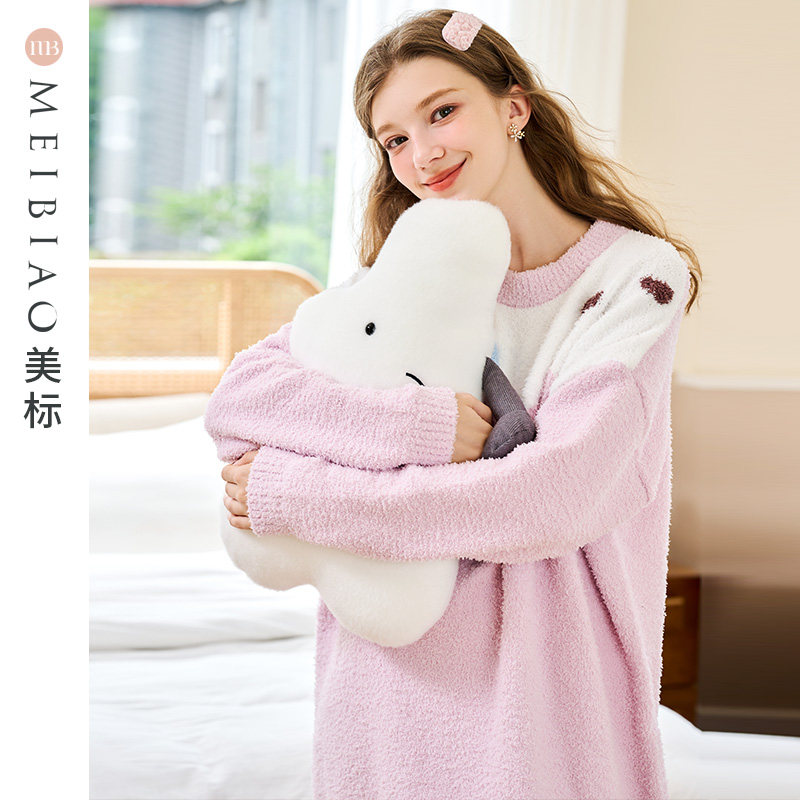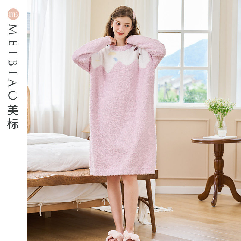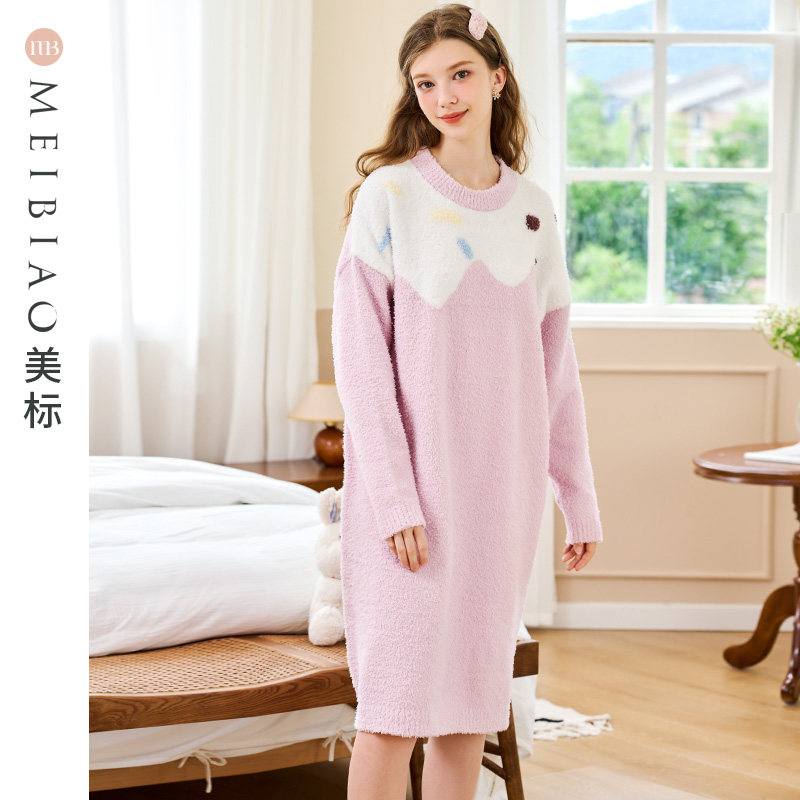 美标半边绒保暖睡裙女秋冬雪尼尔睡衣珊瑚绒甜美可爱可外穿家居服