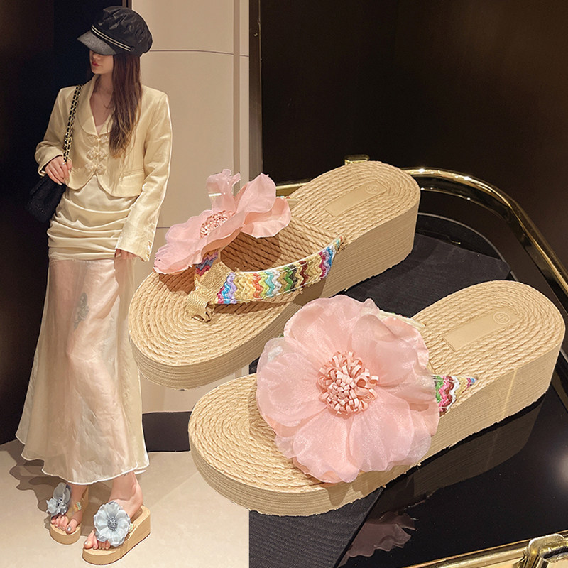 坡跟人字拖女夏季草编花朵厚底鞋海边沙滩鞋凉鞋鞋子高跟防滑橡胶