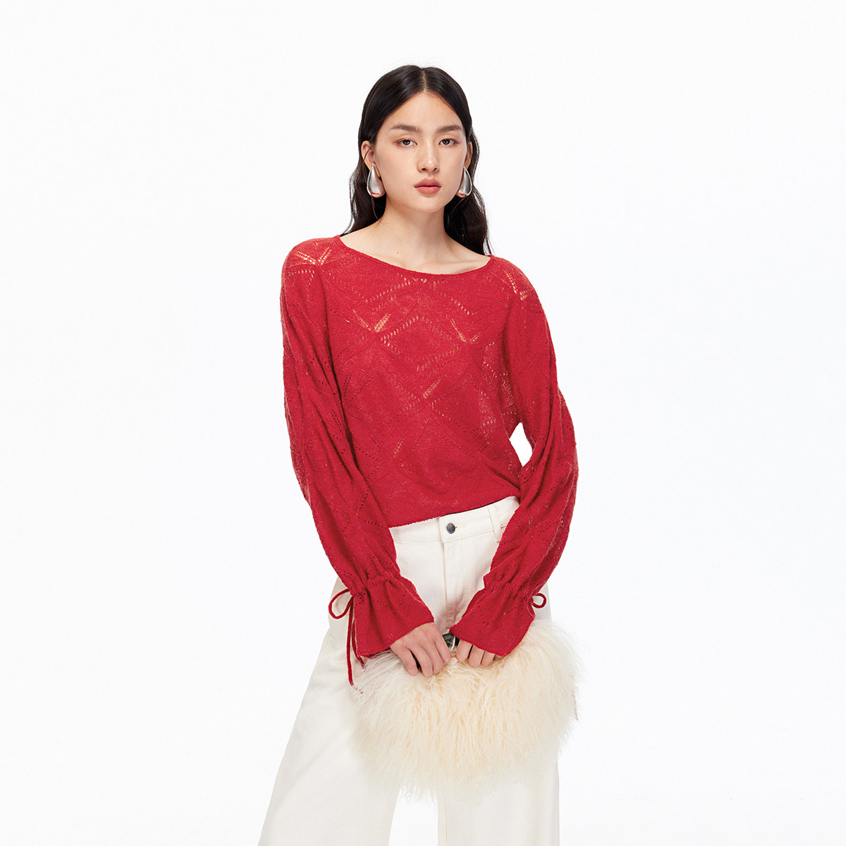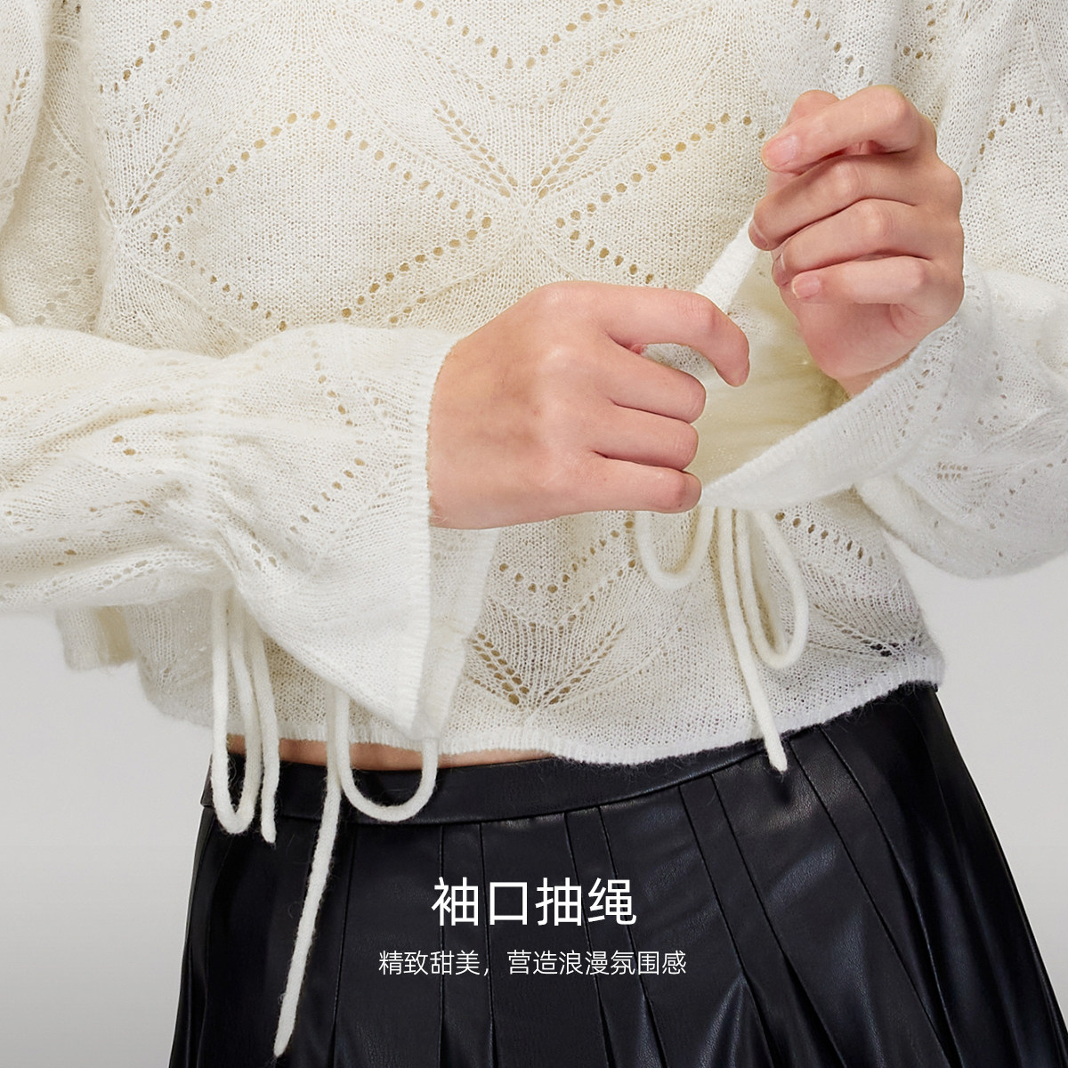 质感针织面料,大气圆领设计,袖口抽绳细节