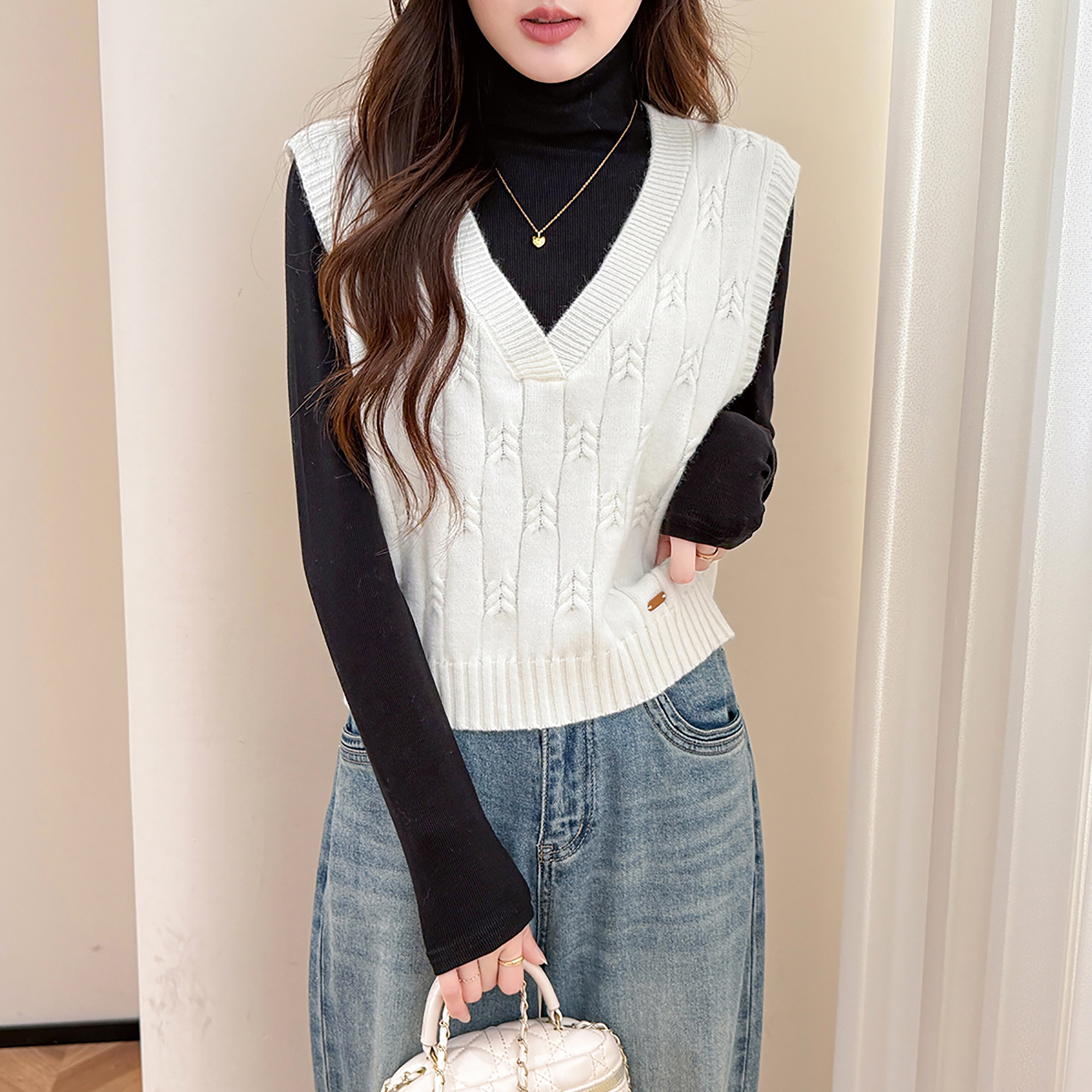 唐狮秋冬季女毛衣设计感绞花V领套头马甲短款背心简约毛线衫tu