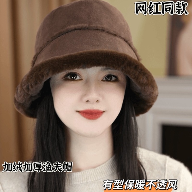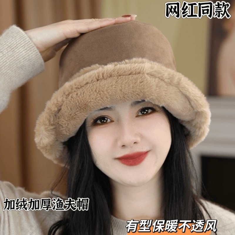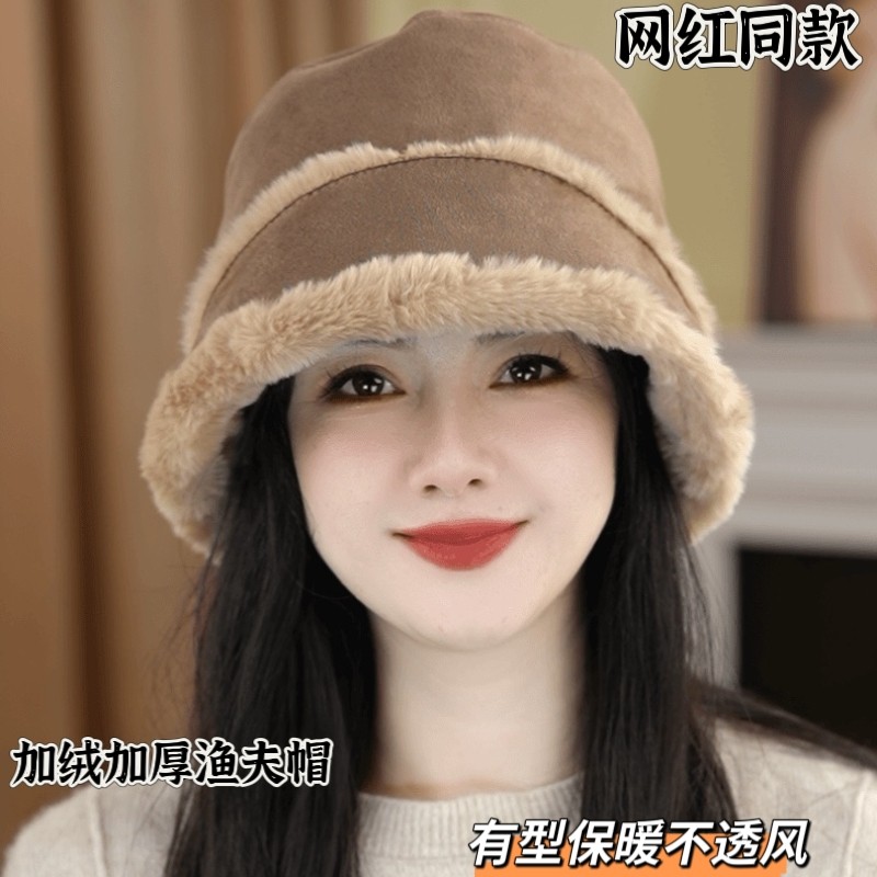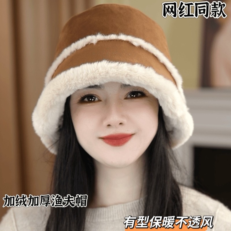 韩版麂皮绒双面戴渔夫帽子女冬季加厚防寒保暖水桶帽显脸小盆帽潮