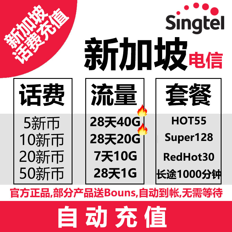 话费充值:可用于买流量,打电话,红利BOUNS只能用于打电话不能订流量 流量充值: 直接充值到帐,拔*100#回复1查流量 产品为自动充值,境外号码请填写新加坡号码,系统会自动识别65区号空格 充值前请务必关闭移动数据,因数据未关闭导致余额被扣光事件容易发生 去领券购买 ->