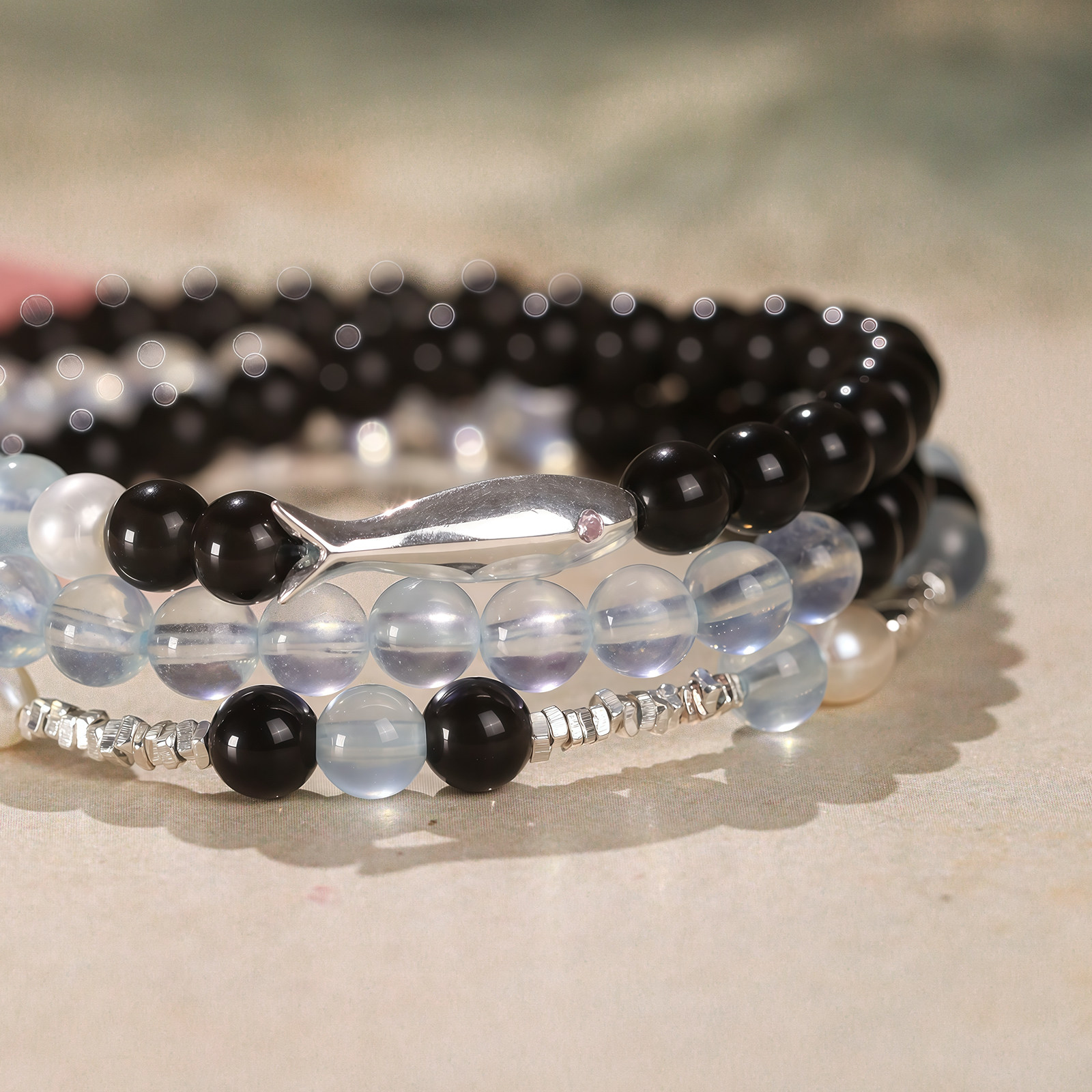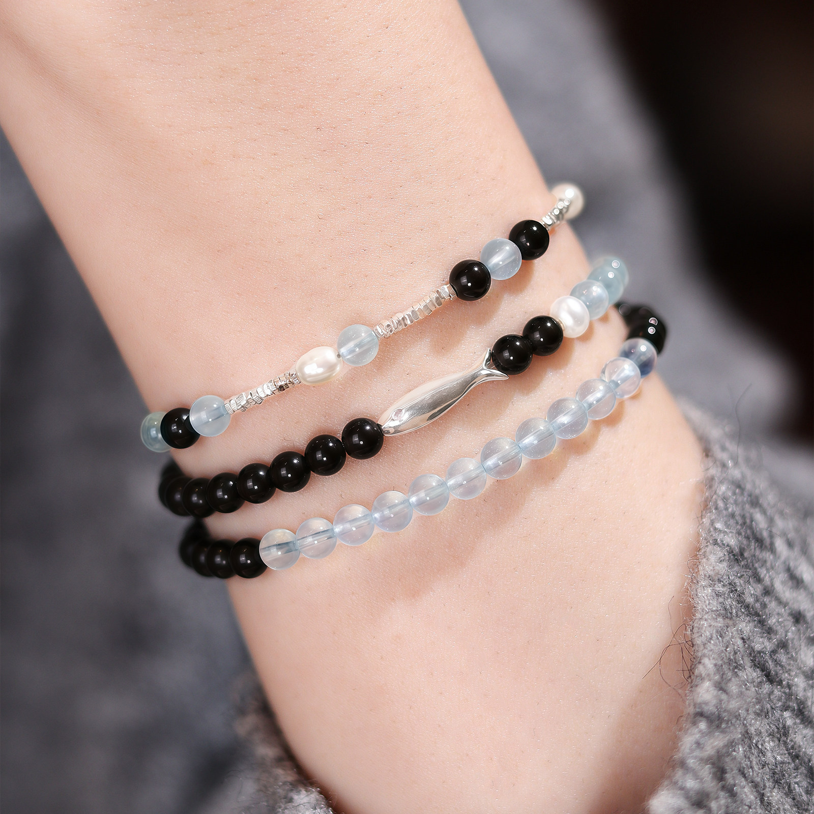 鱼悦安招财天然黑曜石海蓝宝手串女款纯银小鱼碎银珍珠手链小众