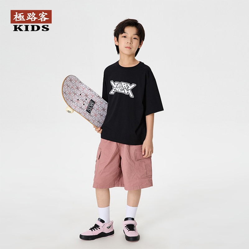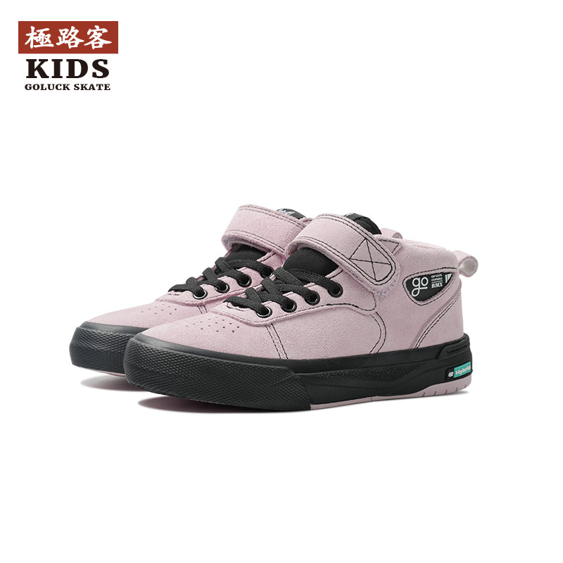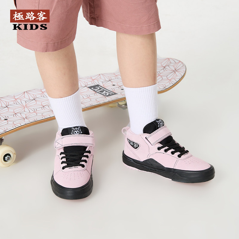 极路客春季新款专业儿童BMX板鞋黑粉中帮魔术贴小轮车耐磨滑板鞋