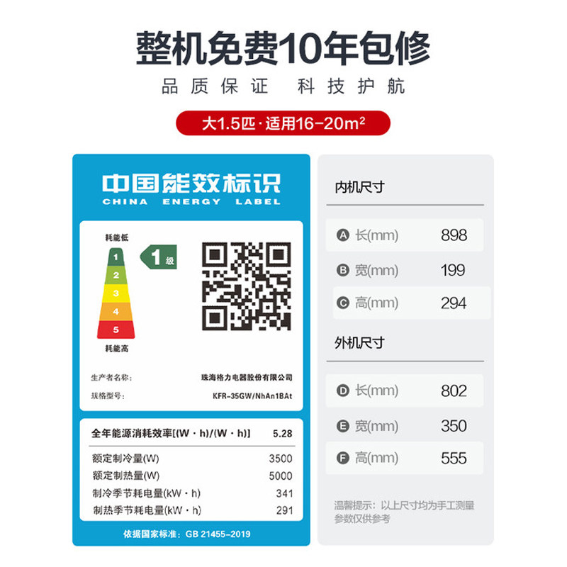 海尔净畅1.5匹空调家用挂式变频一级能效挂机冷暖两用卧室小型GCA