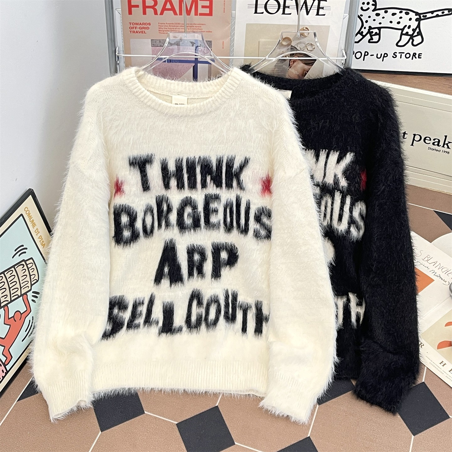 美式复古慵懒风仿貂绒软糯毛衣男女秋冬季字母提花情侣宽松针织衫