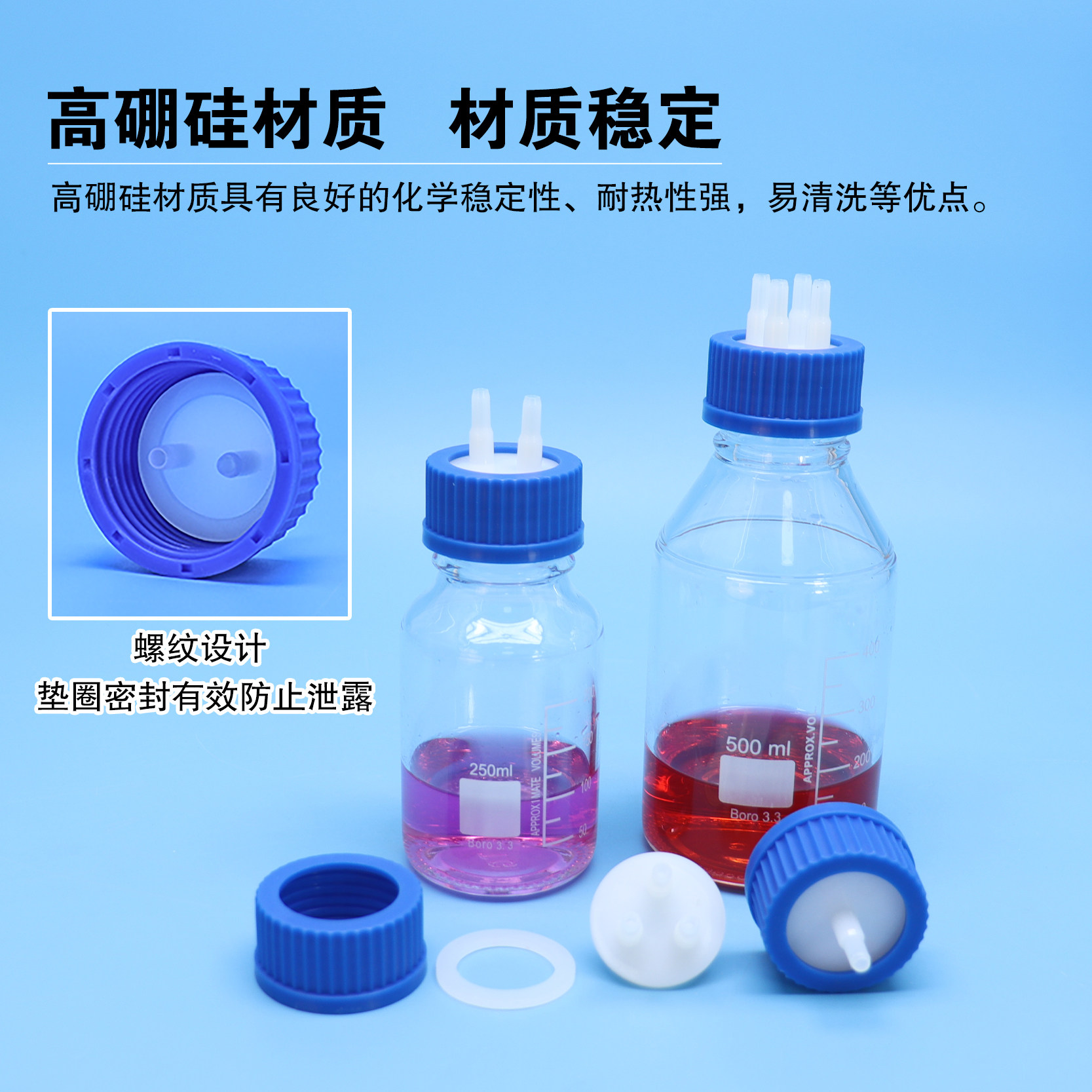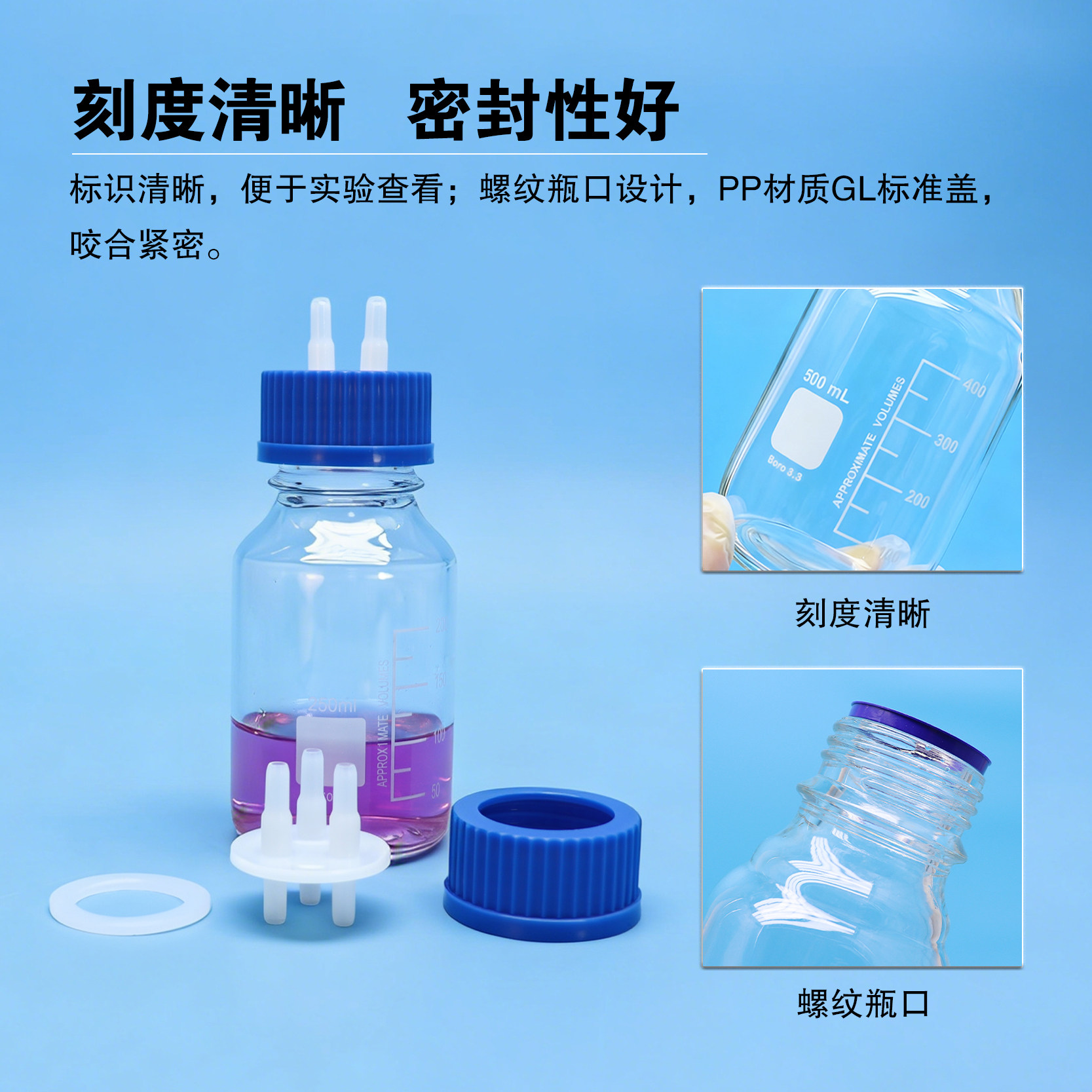 协盈补料瓶发酵罐加料瓶高纯塑料孔盖废液缓冲负压吸引瓶蓝盖玻璃真空桌面仪器补液发酵取样非洗气瓶
