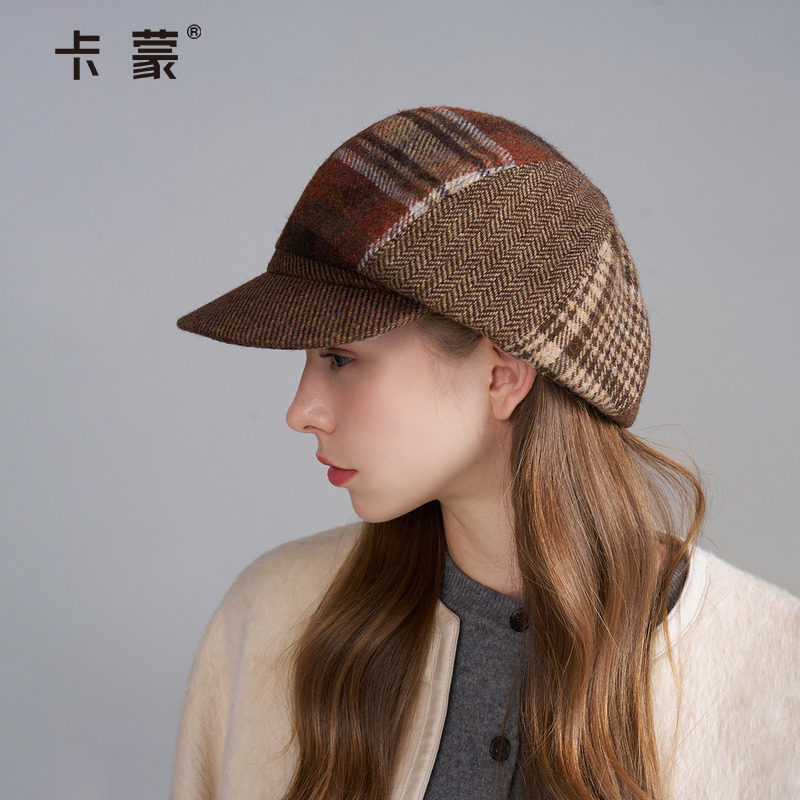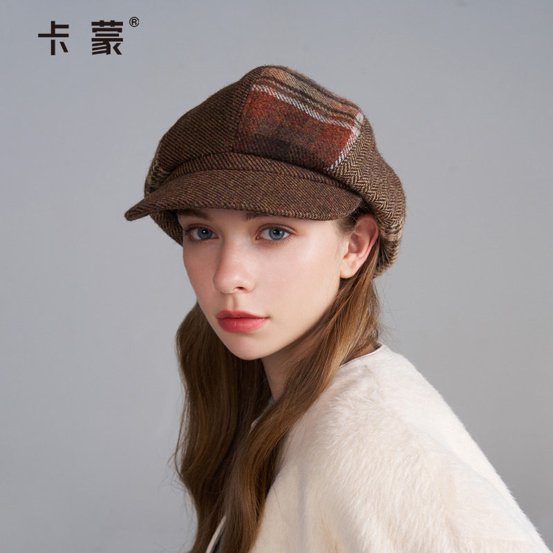 卡蒙绵羊毛时尚复古棕色贝雷帽女显脸小秋冬季大头围英伦风画家帽