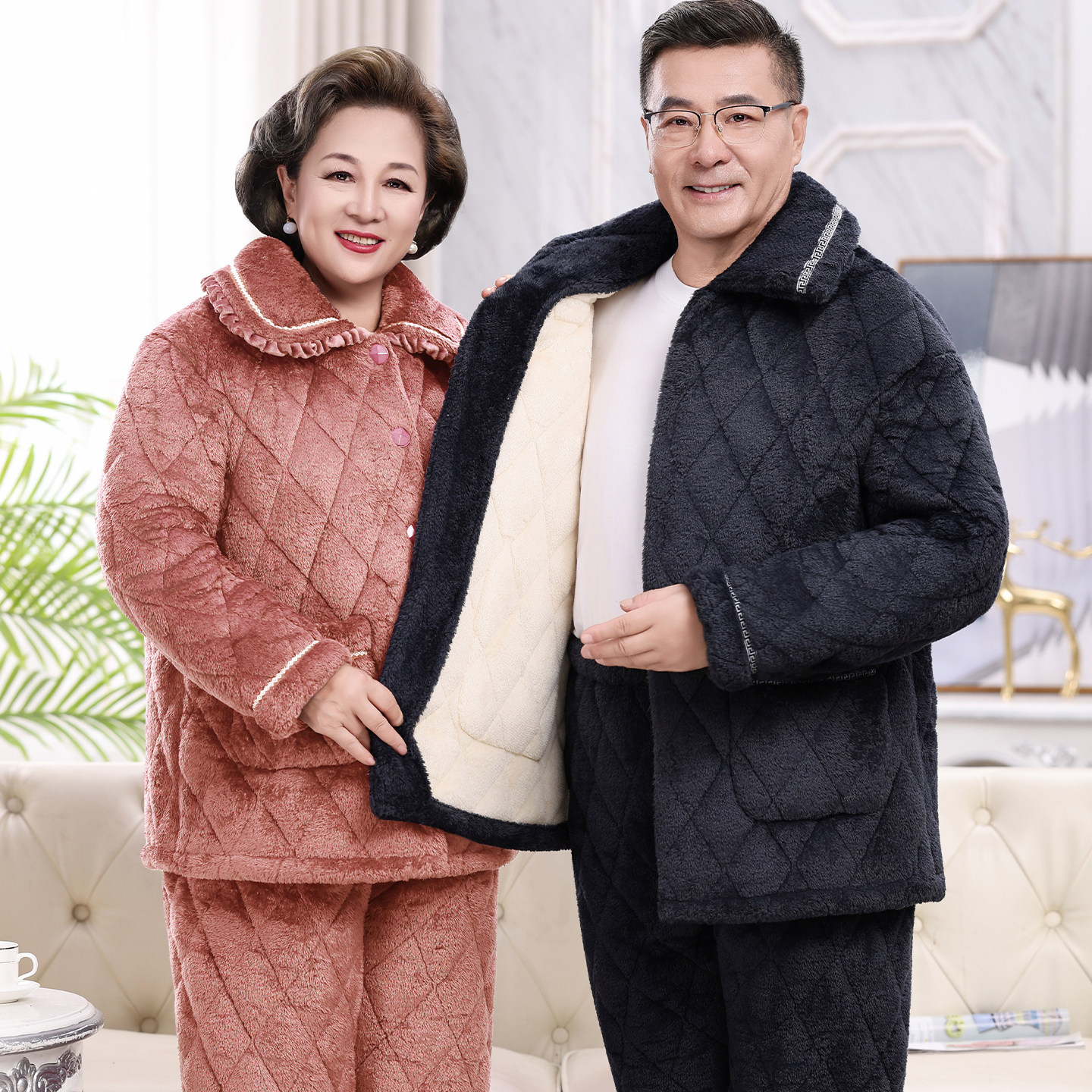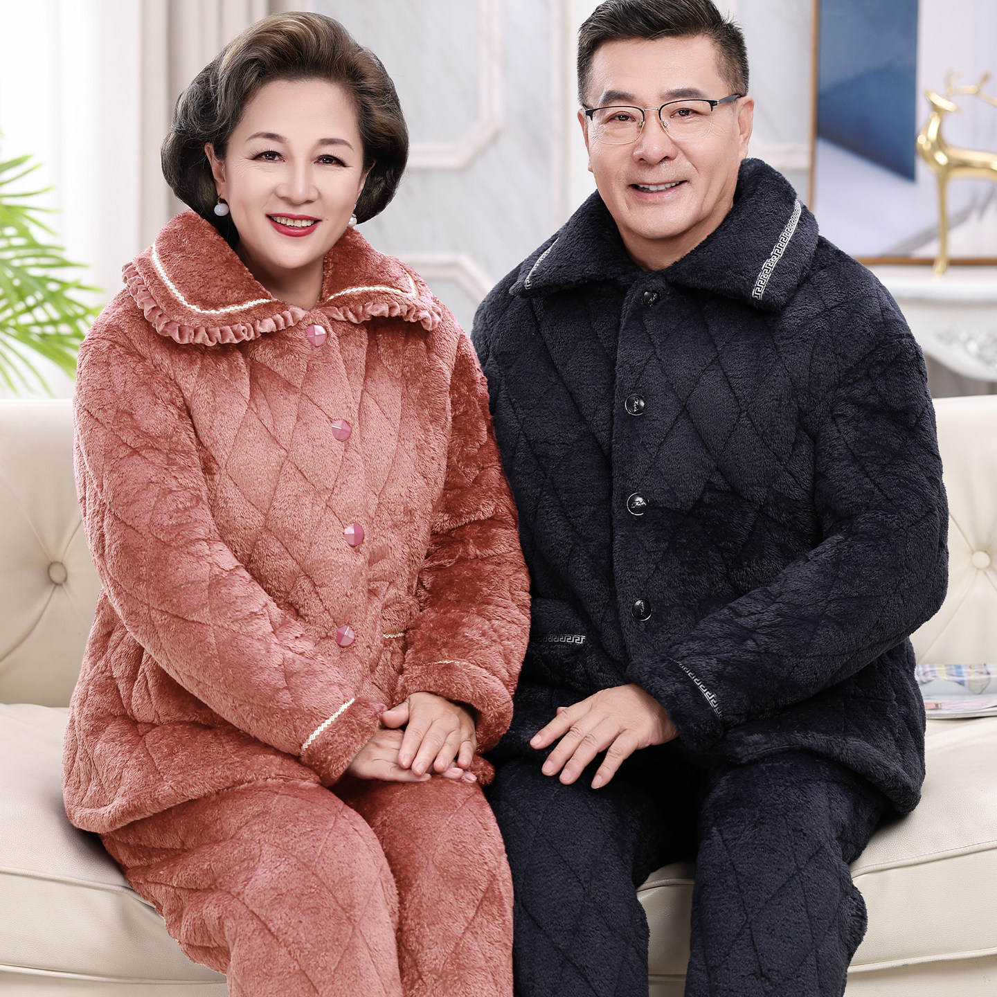 睡衣冬加厚女款2025新款珊瑚绒三层加绒保暖家居服男中老年可外穿