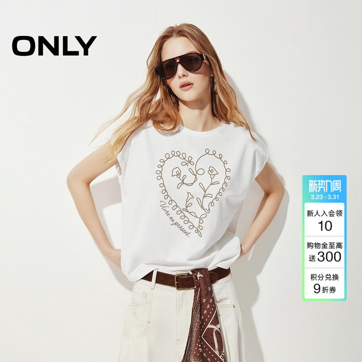ONLY2026春季新款艺术感植绒刺绣微落肩桃心花朵印花上衣T恤女