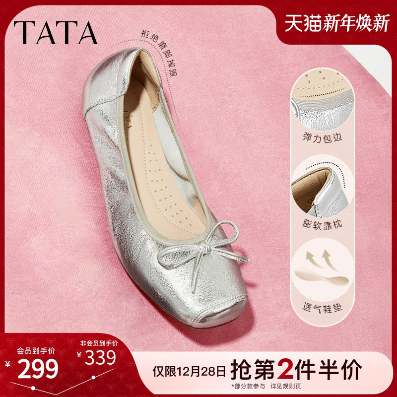 TATA他她银色芭蕾舞鞋平底单鞋女鞋软底豆豆鞋羊皮鞋子UUY01CQ5
