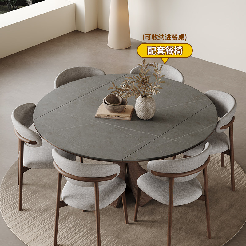 实木伸缩餐桌轻奢现代简约家用小户型意式侘寂风方圆两用岩板圆桌