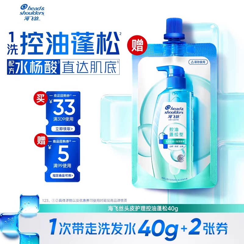 【百补】专享优惠券 送海飞丝头皮预洗10g+控油蓬松洗发水40g