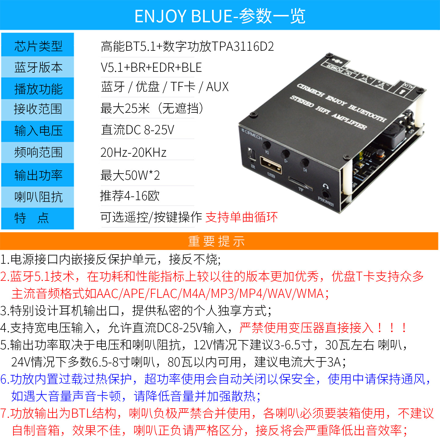 HIFI蓝牙5.1数字大功率TPA3116D2立体声2.0双声道TF优盘AUX功放板