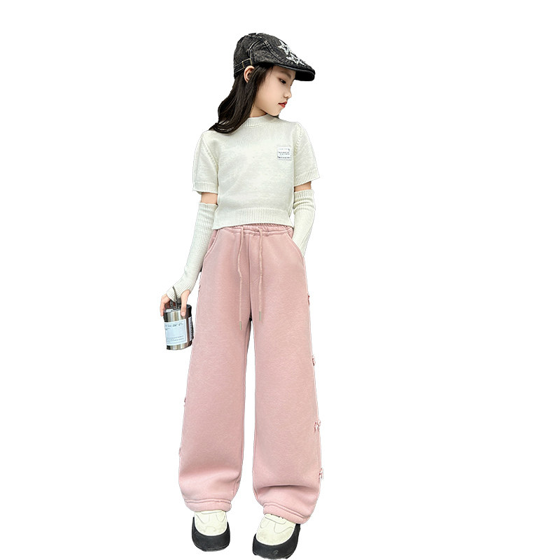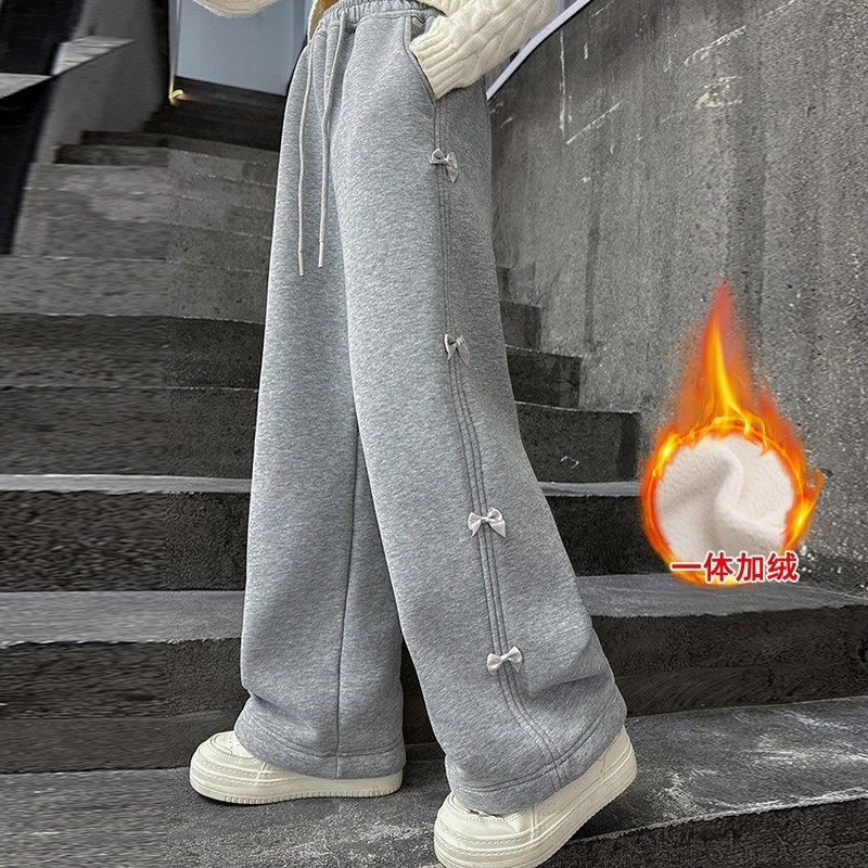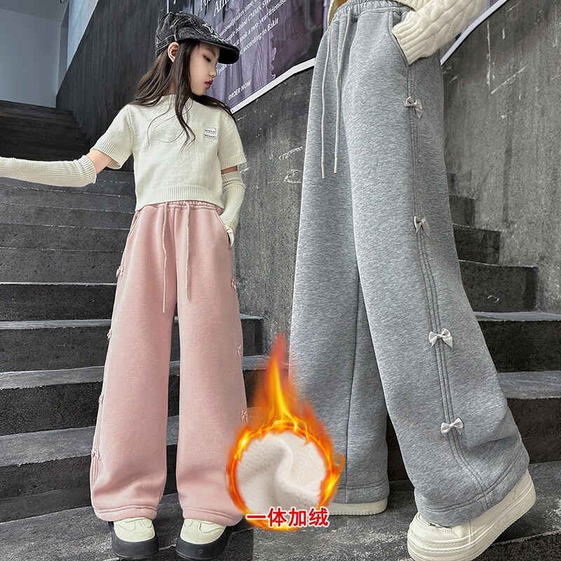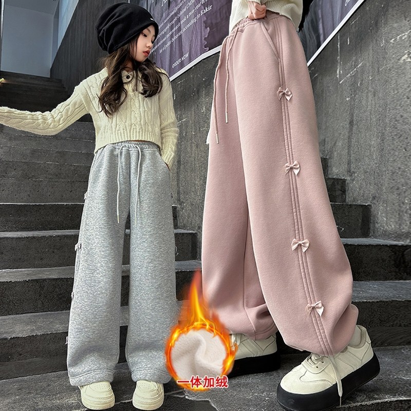 女童运动裤子2025秋冬新款中大童蝴蝶结加绒卫裤儿童宽松直筒长裤