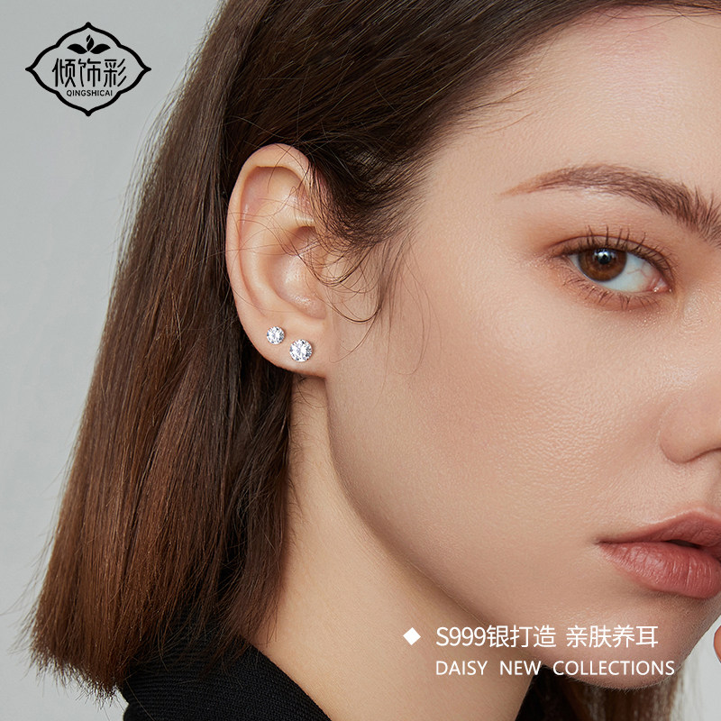 999纯银耳钉女养耳洞耳骨钉小众高级感锆石耳蜗钉水钻耳环银耳饰