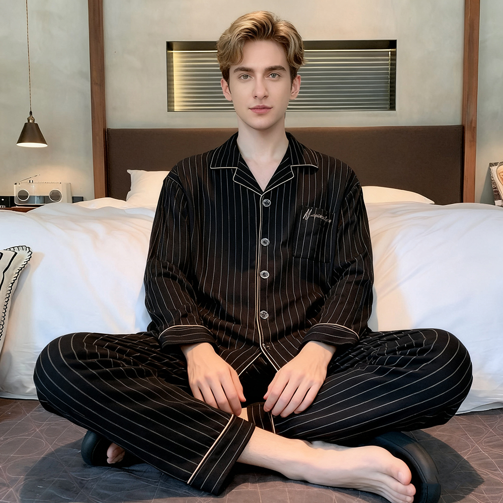 2025年新款睡衣男士秋冬款棉质宽松长袖开衫翻领高级感家居服套装