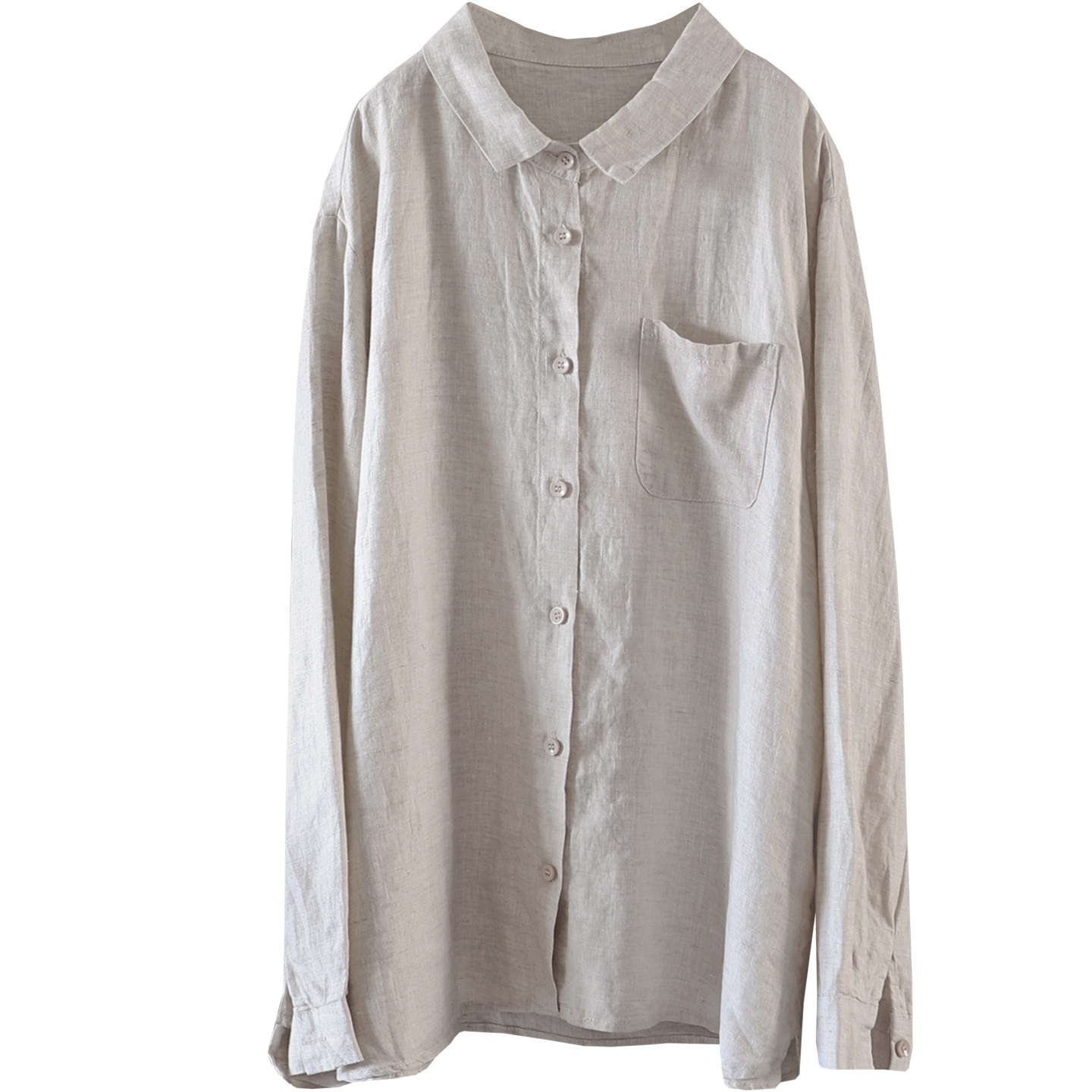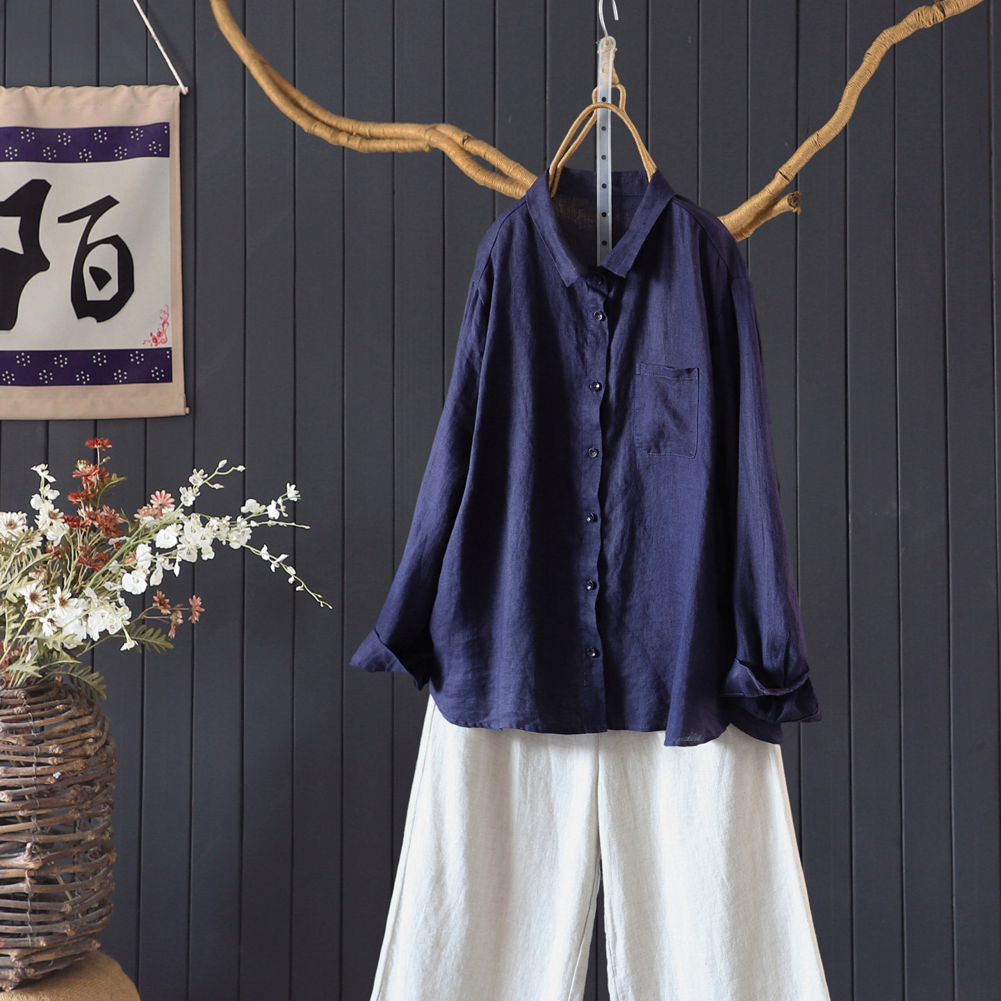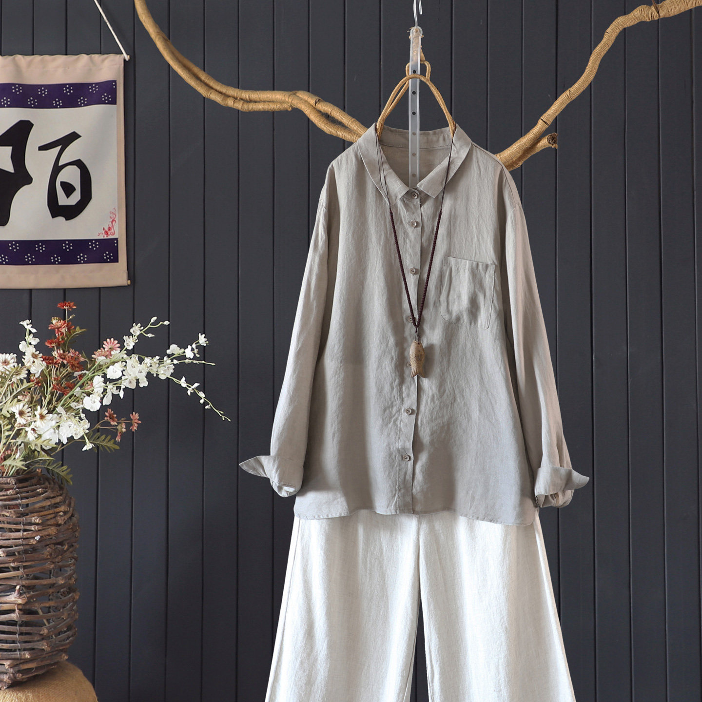 2025秋宽松慵懒纯色100%亚麻衬上衣小翻领长袖内里包边衬衣麻衫女