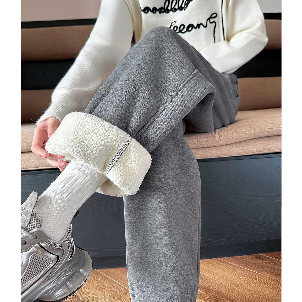 yoe秋冬休闲长裤女加绒加厚仿羊羔绒保暖灰色简约百搭束脚裤tuTA