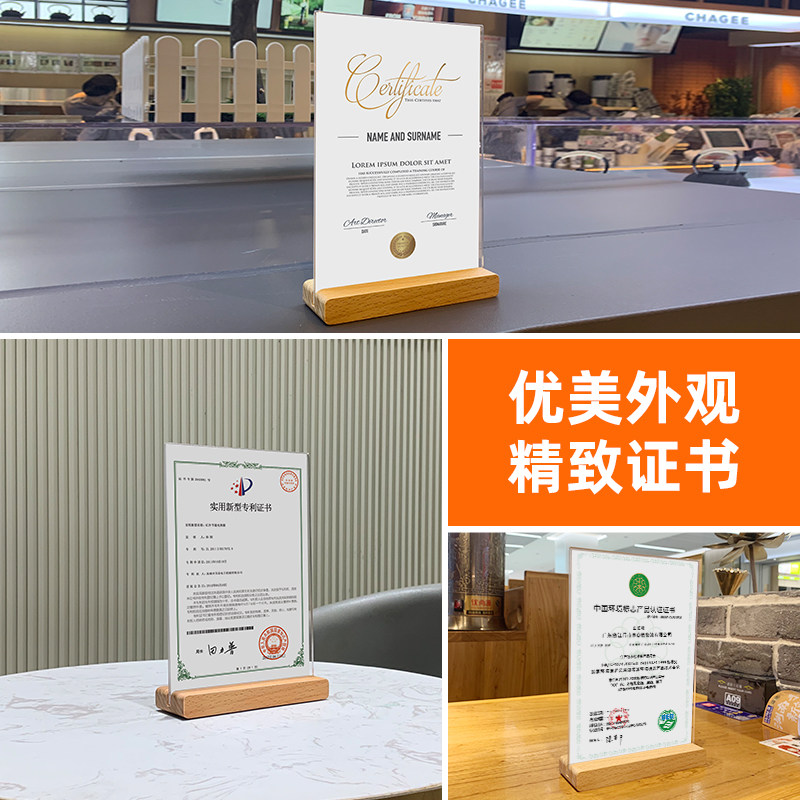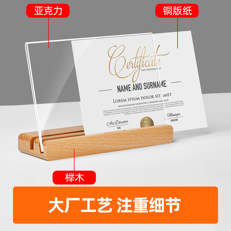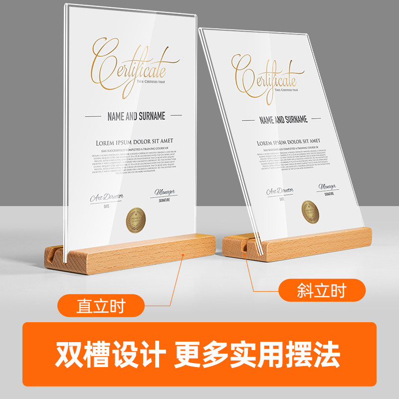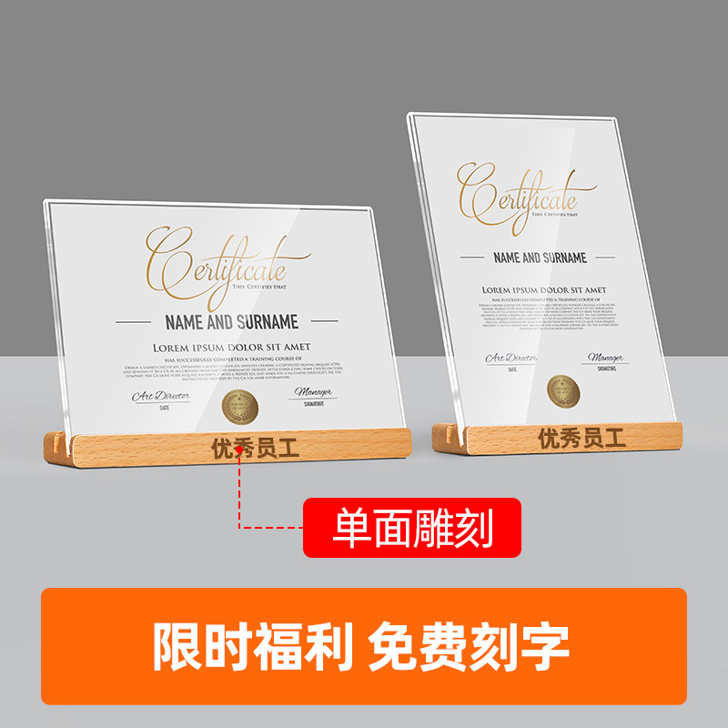 荣誉证书框支架亚克力立牌授权书裱框架摆台木质a4相框奖状展示框