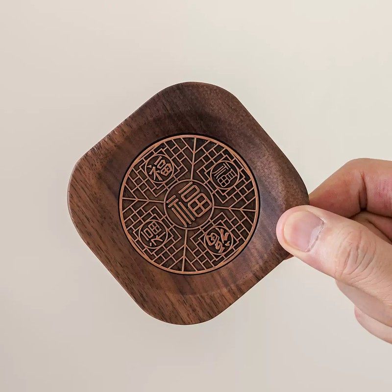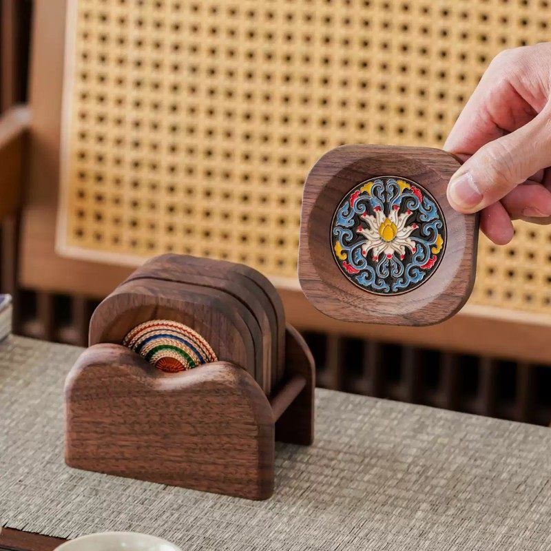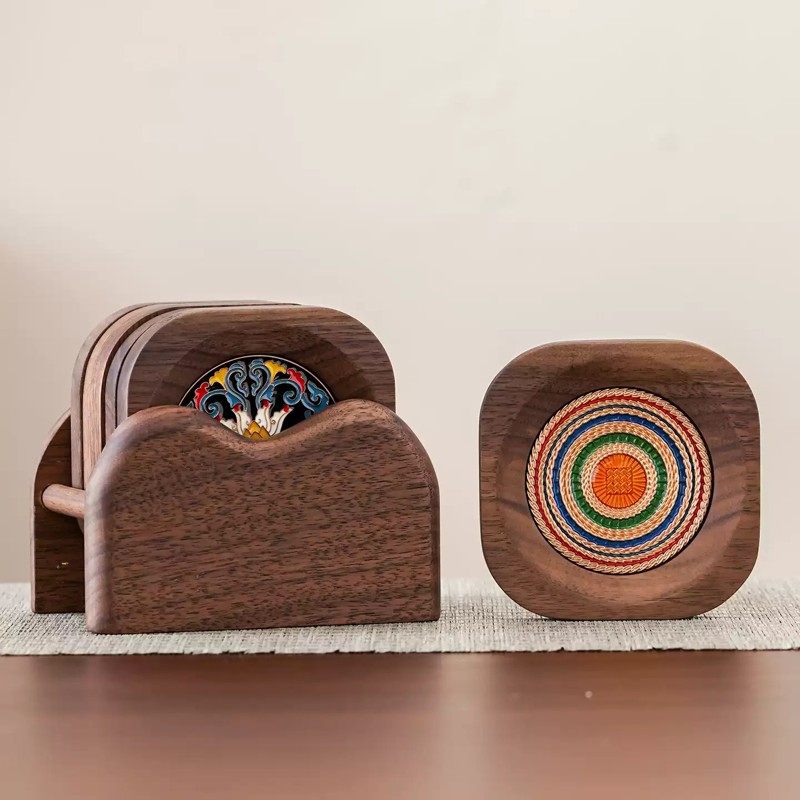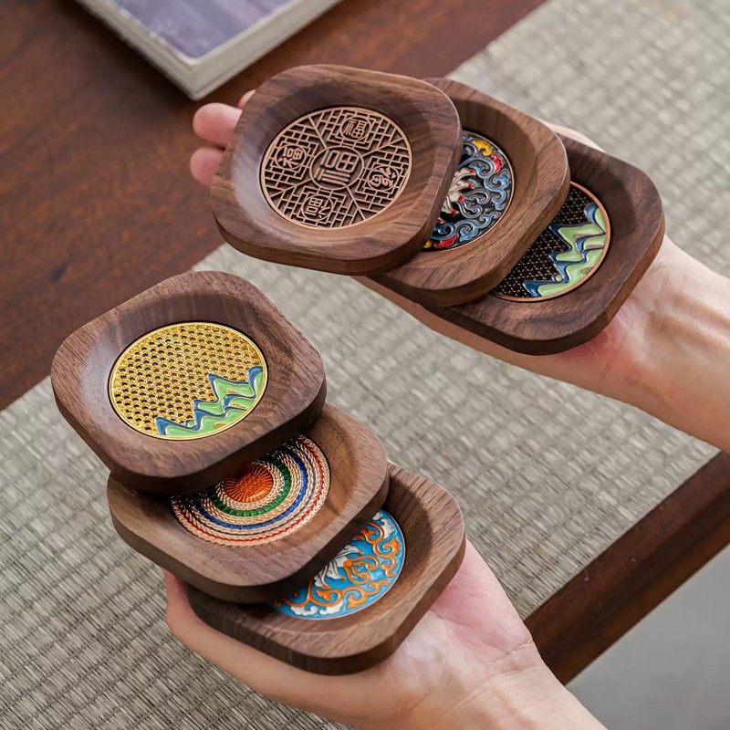 中式高档胡桃木茶杯垫珐琅彩实木隔热杯托防烫功夫茶具零配件带框