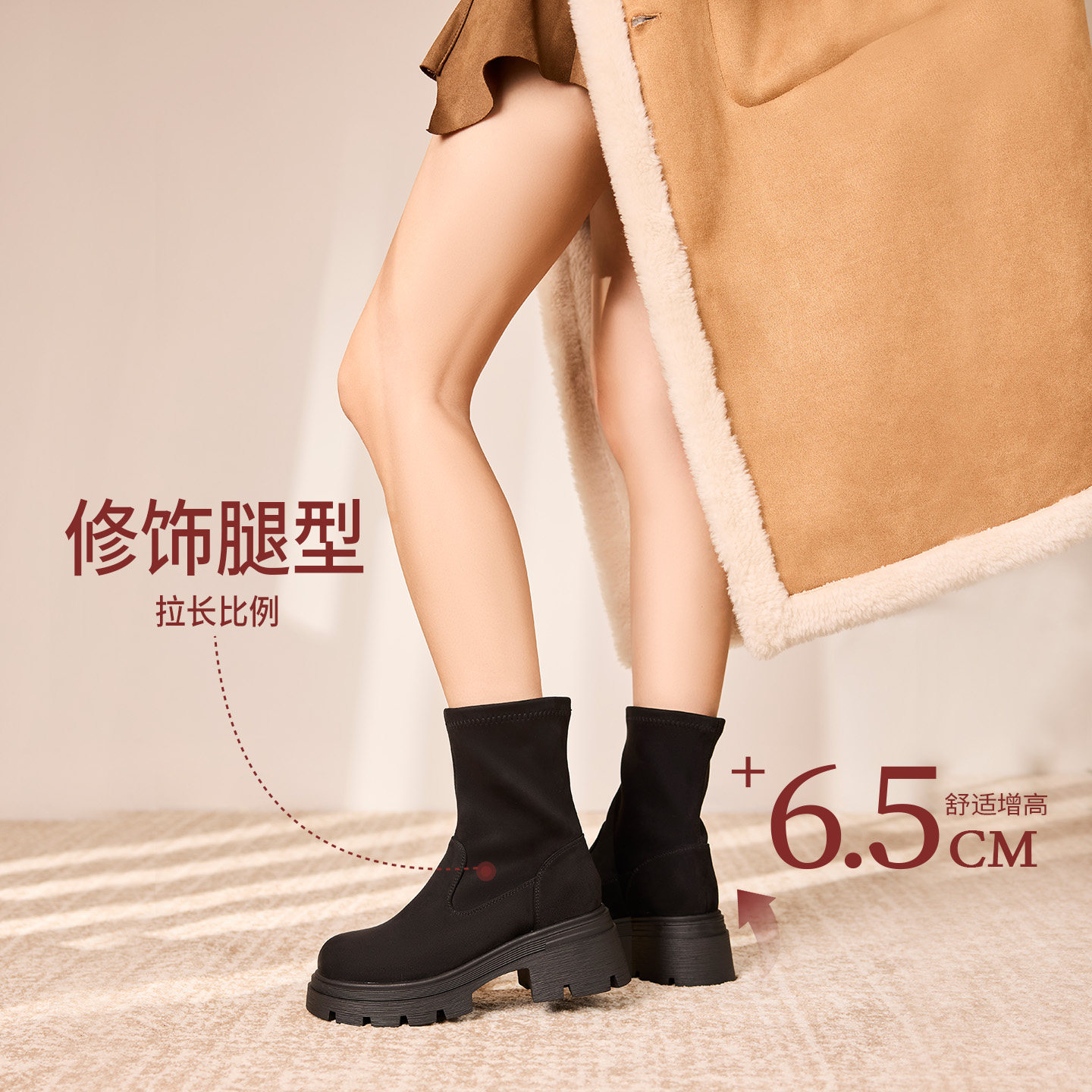 奥康 女鞋2025冬季弹力靴酷飒圆头套脚时装靴时尚厚底增高短靴