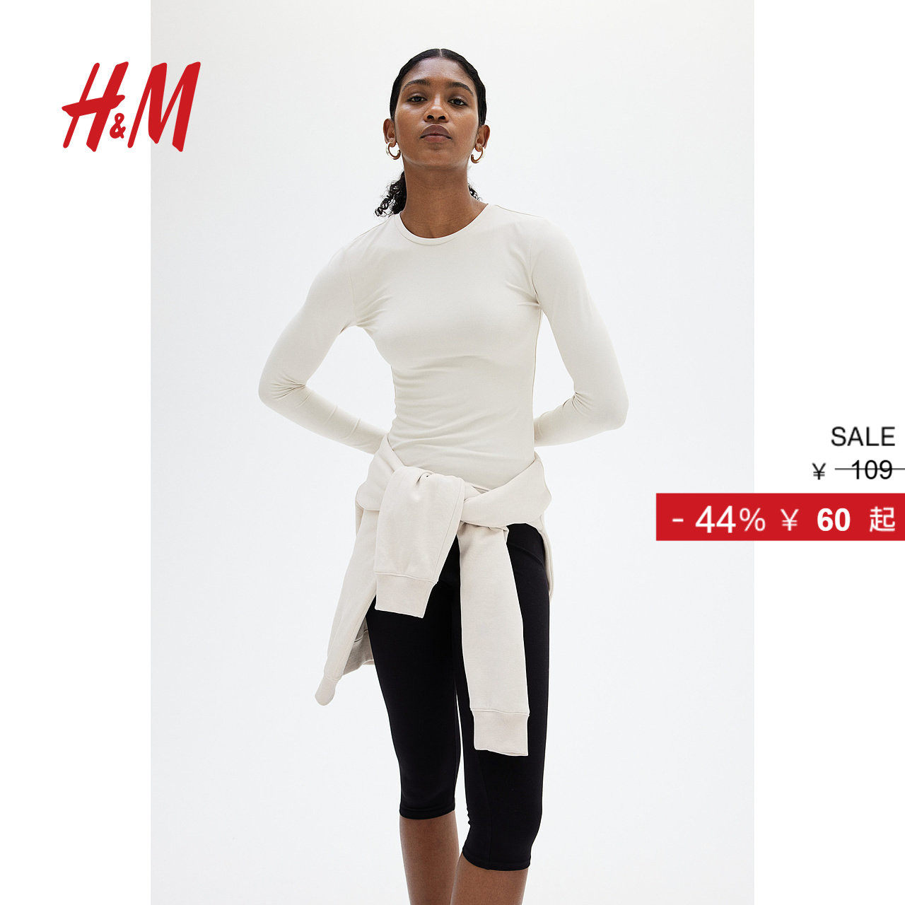 HM女装T恤冬季弹性圆领修身舒适休闲长袖款打底衫内搭上衣1191700