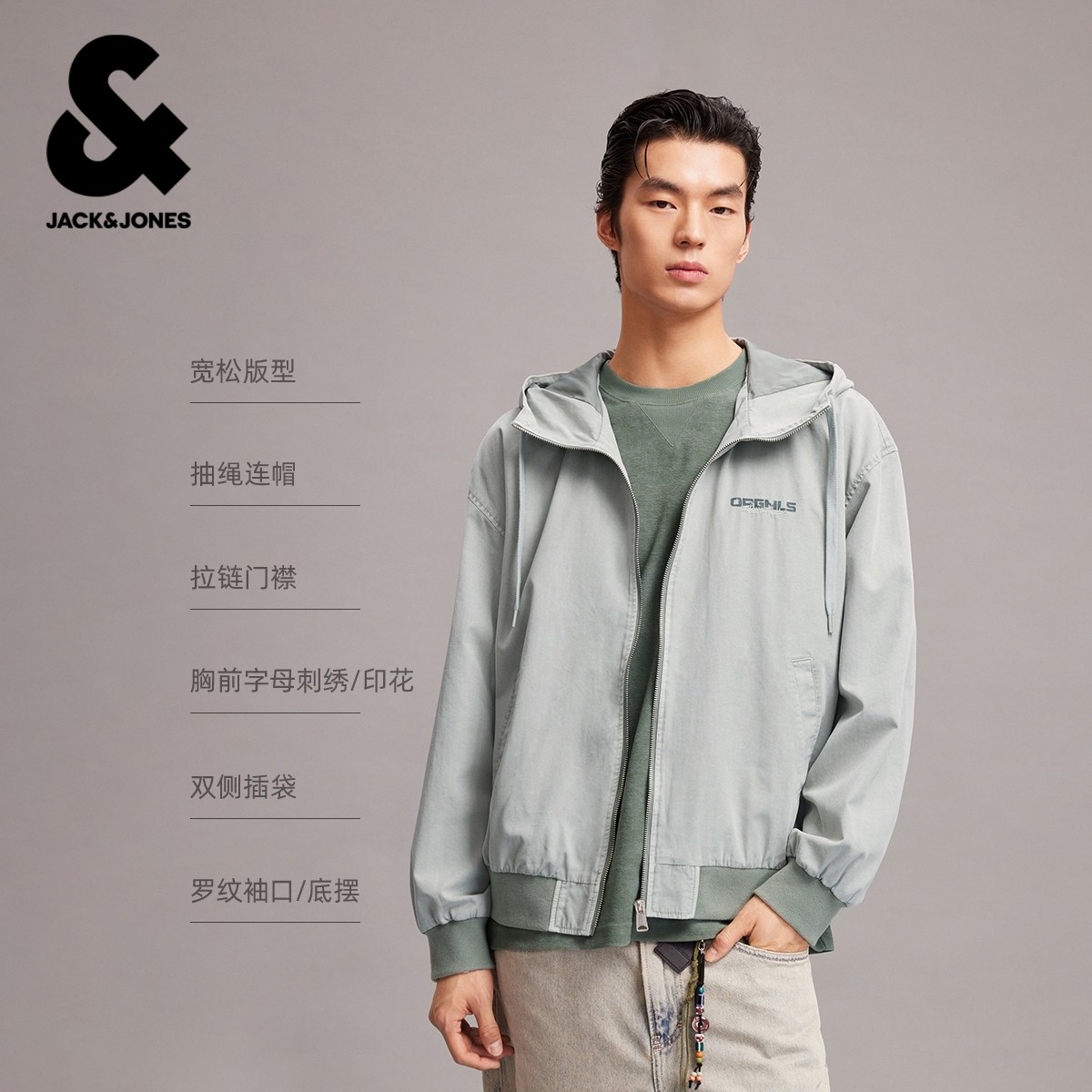 杰克琼斯男装春季新款字母刺绣印花抽绳连帽休闲宽松牛仔夹克外套