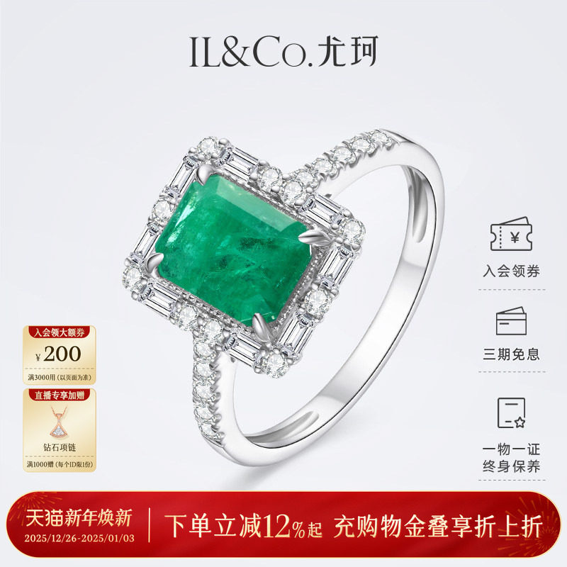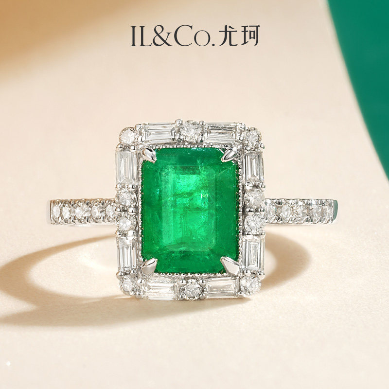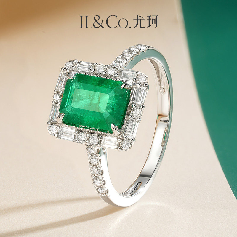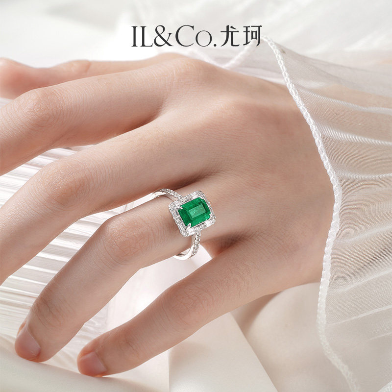 ILCO尤珂 白18K金祖母绿女戒天然彩宝钻石围镶方形奢华尊贵戒指